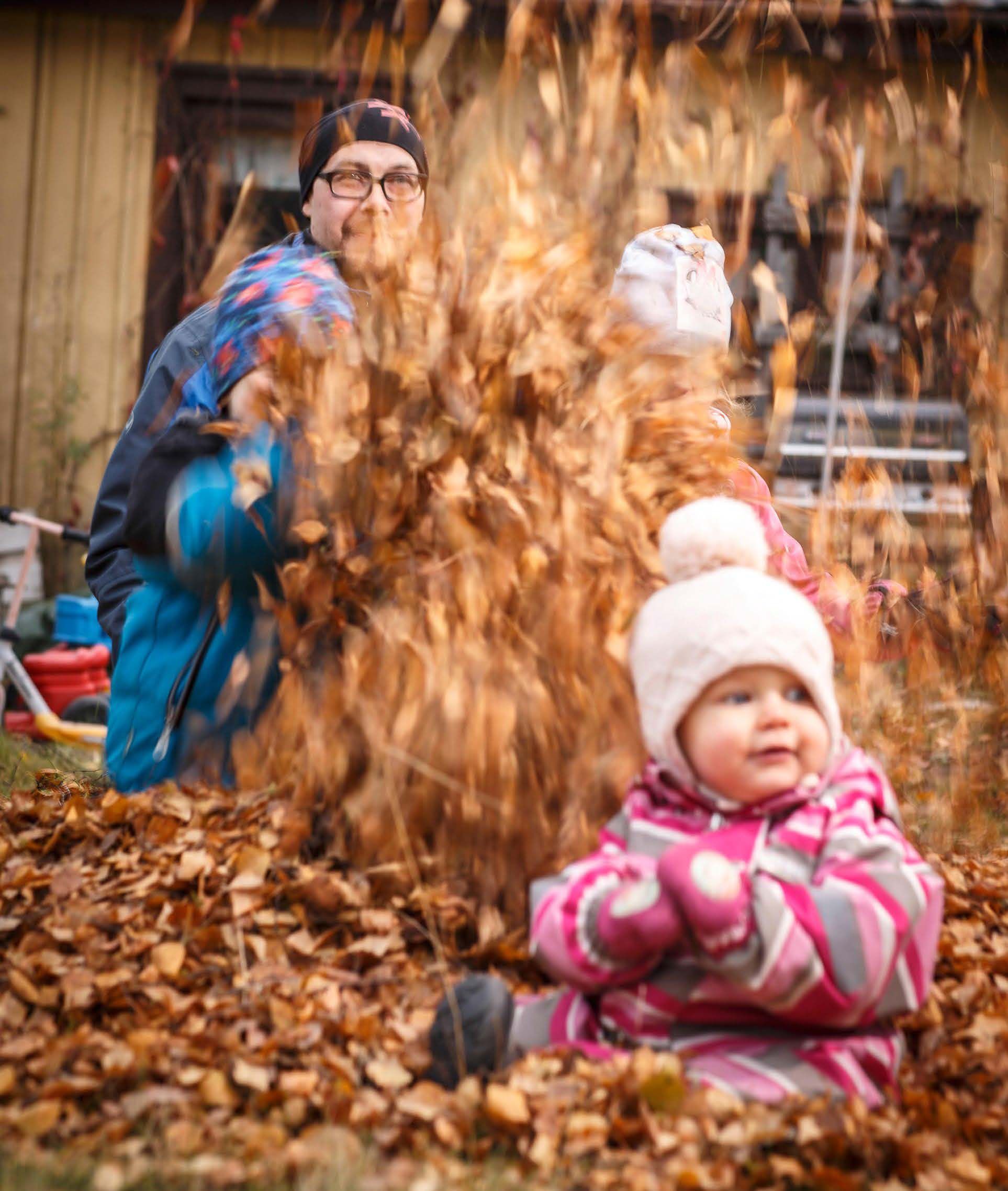 Nautin työstäni ja perhe-elämästä. Puuhailemme lasten kanssa paljon ulkona. Parasta on, kun saan katsella heidän riemuaan, vaikkapa sitä, kun he levittelevät kaikki kasoihin haravoidut lehdet pitkin pihaa.