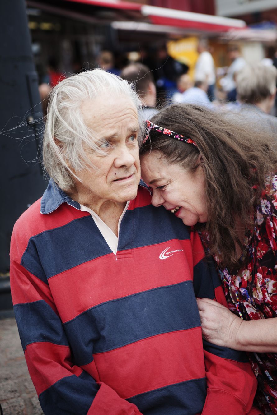 Kaksi La Stradan kehitysvammaista näyttelijää kävelee ohi. He juttelevat iloisesti keskenään.