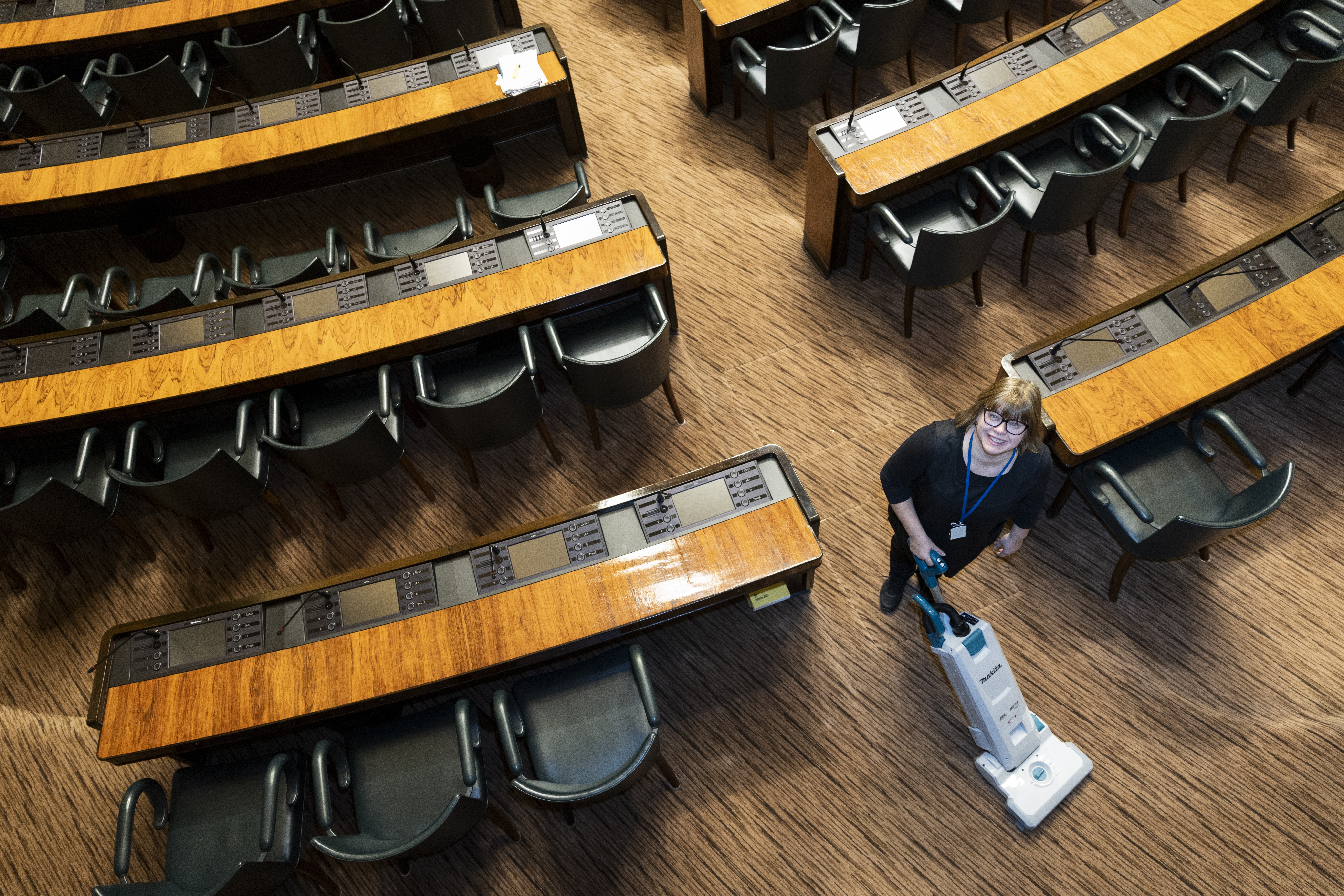 Halusin tänne töihin niin paljon, että jätin vakituisen työpaikkani päiväkodin siivoojana ja otin vastaan määräaikaisen työn eduskunnassa. Minun alallani tämä on ihan huippupaikka. Eduskuntaa siivoaa 33 laitoshuoltajaa. Olemme eduskunnan palkkalistoilla ja valtion virkamiehiä. Eduskunnan laitoshuoltajilta vaaditaan alan ammattitutkinto. Työ täällä vaatii erityistä ammattitaitoa, kun on esimerkiksi paljon eri materiaaleja, kuten puuta, marmoria ja metallikaiteita.”