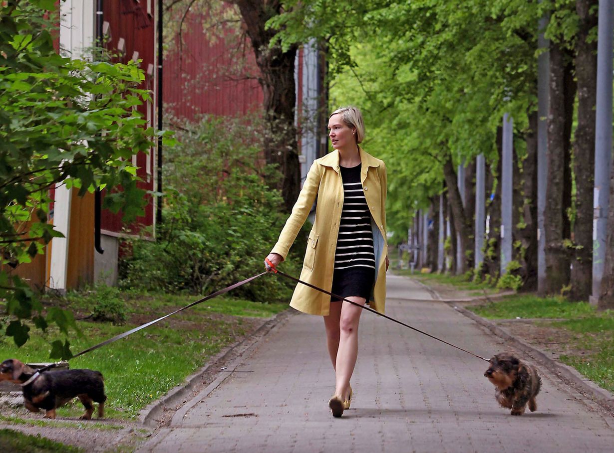 Riikka koirineen Helsingin Käpylässä. ”Koko elämäni minulla on ollut koira. Jos joskus ei ole, tarvitsisin kummikoiran."