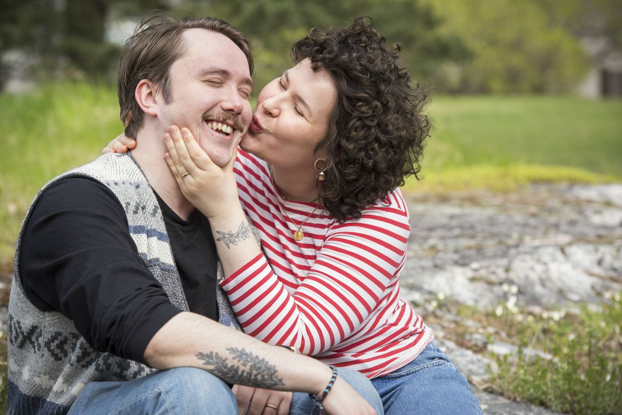 Kuvataiteilija Anna-Karoliina Vainio, 30, ja arkkitehti Elias Salomäki, 31, ovat olleet yhdessä kymmenen vuotta. Naimisiin he menivät kesällä 2024. Pari asuu kerrostaloasunnossa Helsingissä. Anna-Karoliina on intohimoinen virkkaaja, ja Elias harrastaa telttailemista. Joka ilta Anna-Karoliina ja Elias pesevät toistensa hiukset ja vaihtavat samalla päivän kuulumiset.