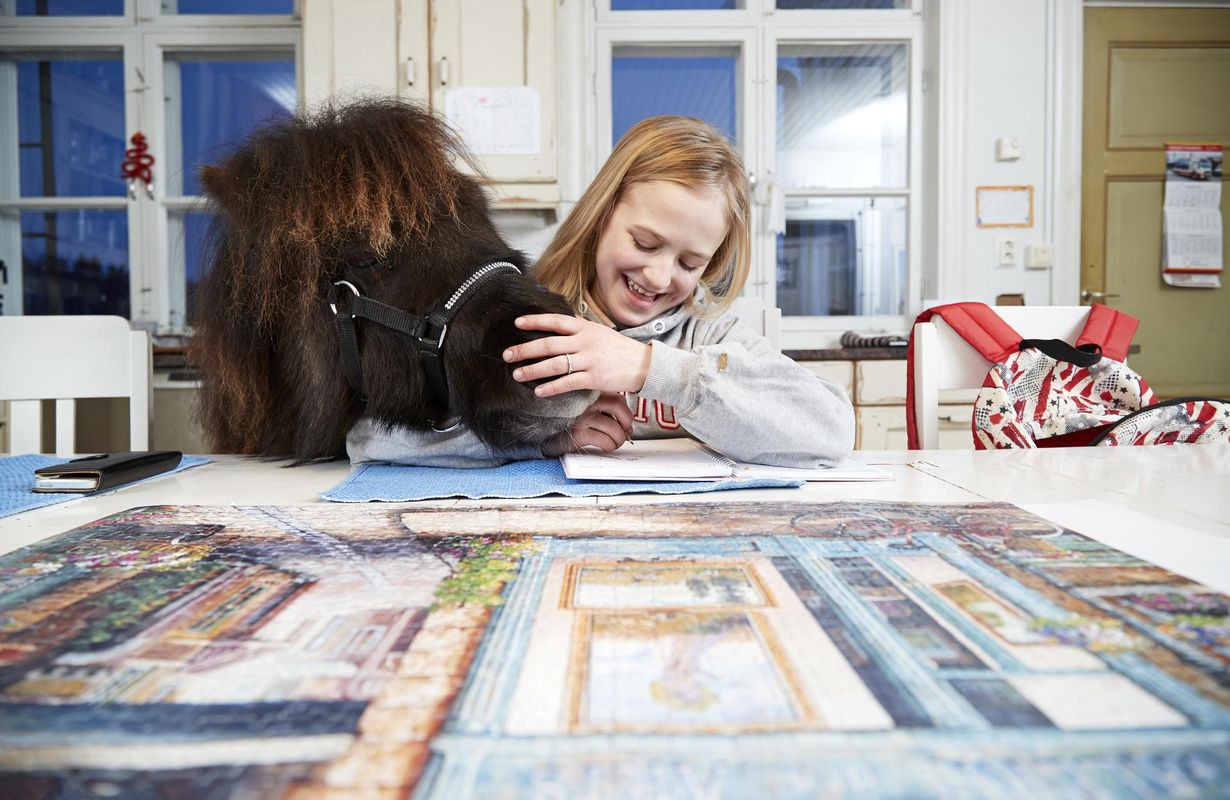Kun silmä välttää, Alfons järsii pöytäliinaa. ”Yleensä saan ottaa ponin sisälle, kun lupaan siivota muutaman ylimääräisen karsinan. Isää pitää taivutella enemmän kuin äitiä”, Patricia sanoo.