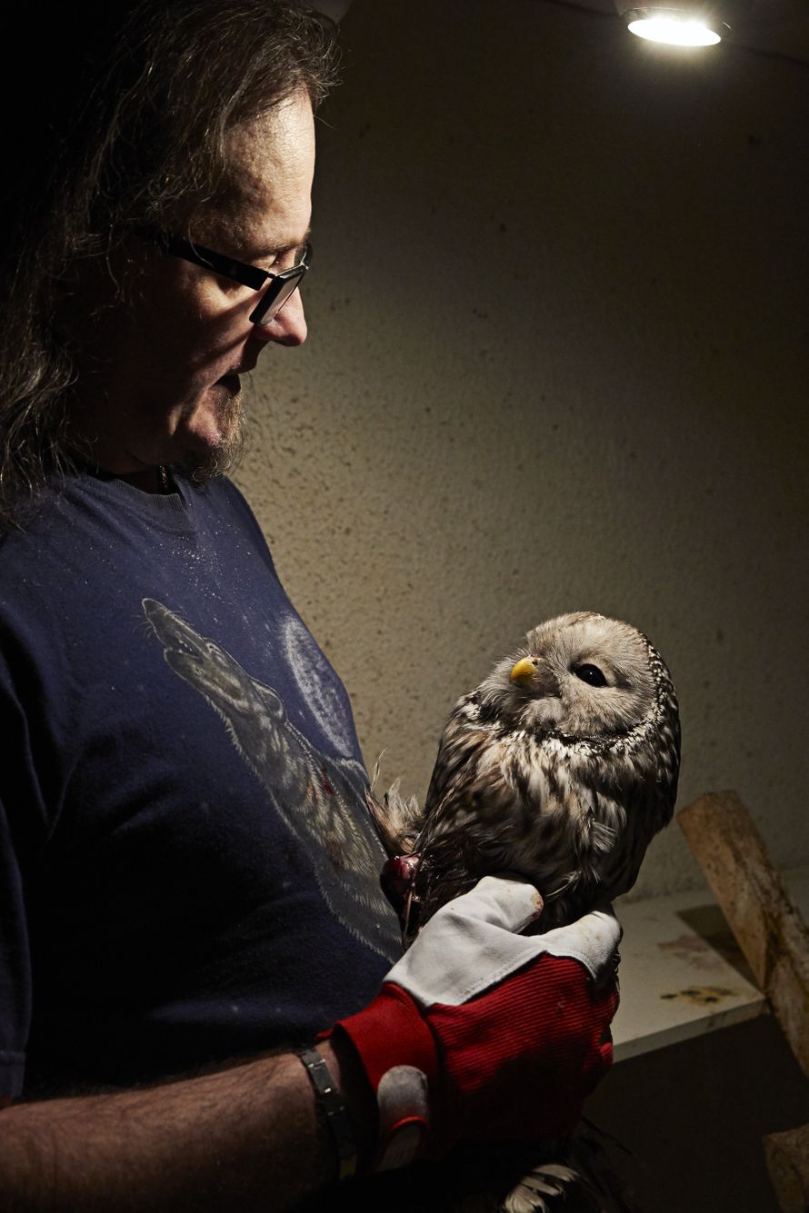 Jarmo poimii kopasta poikasen toisensa jälkeen. Häkeissä sisällä ja ulkona odottavat aamiaista viirupöllö, valkoposkihanhi, kuusi varista, kaksi siiliä, kolme pulua, 14 isompaa oravanpoikaa ja siipivaivainen peipponen.