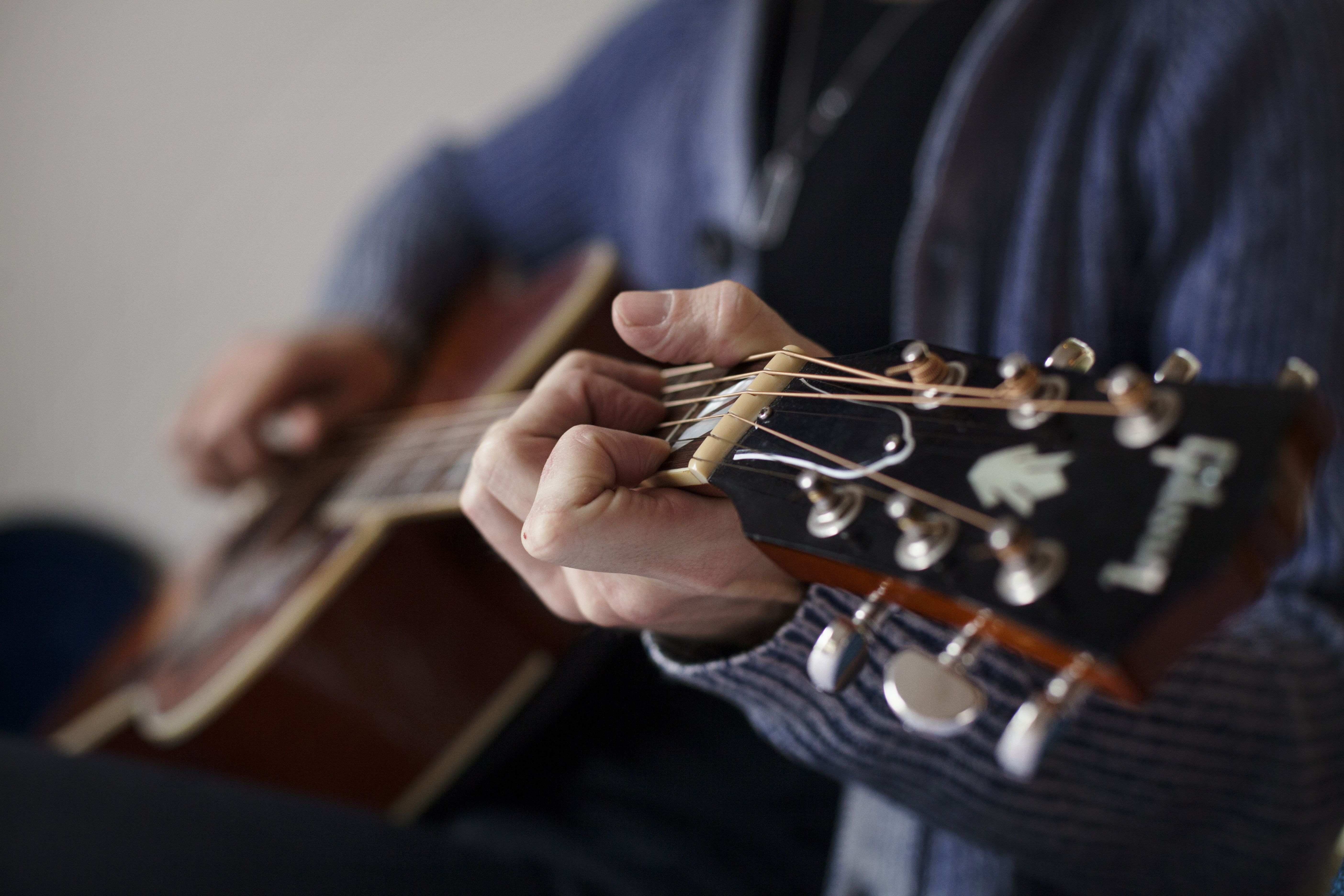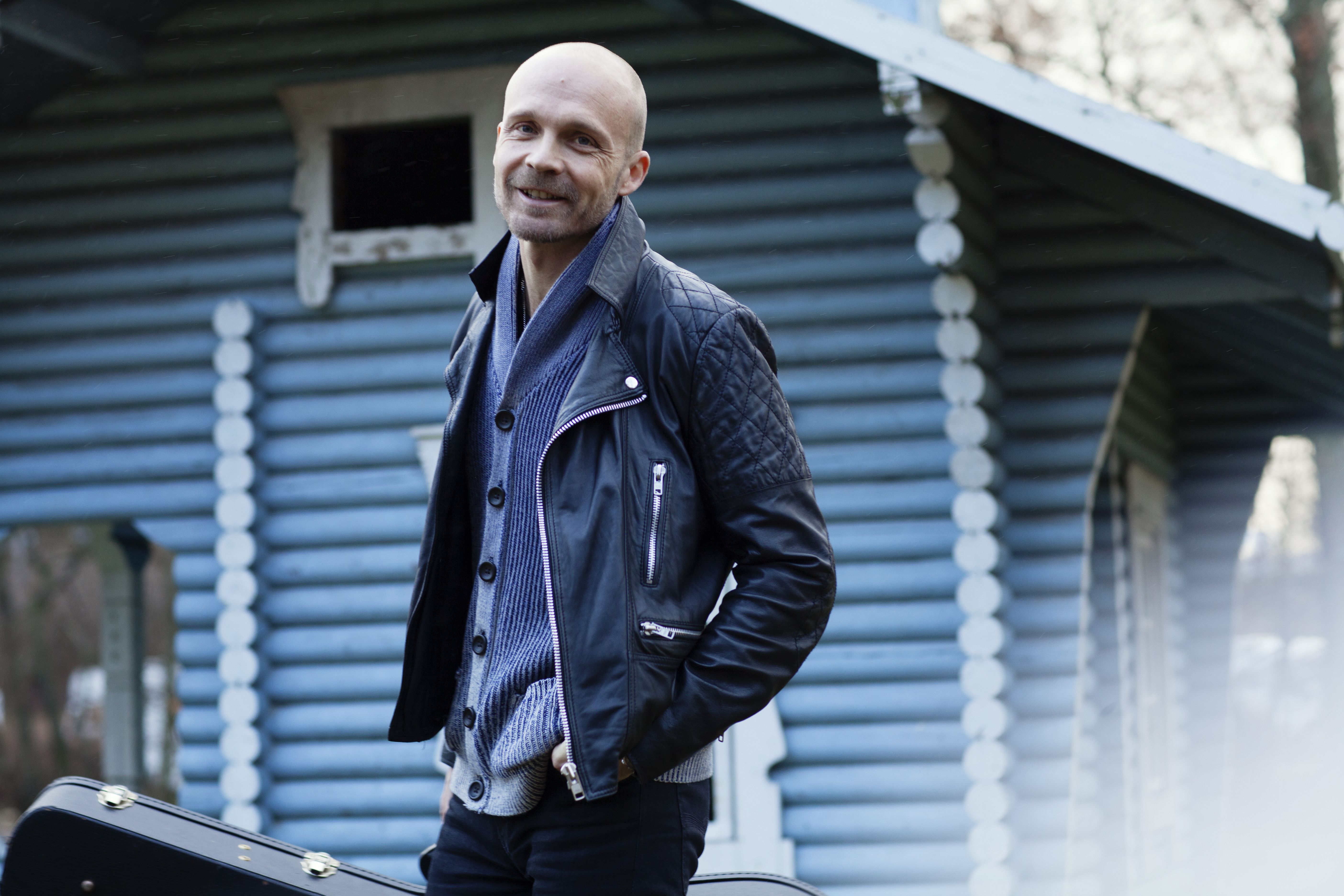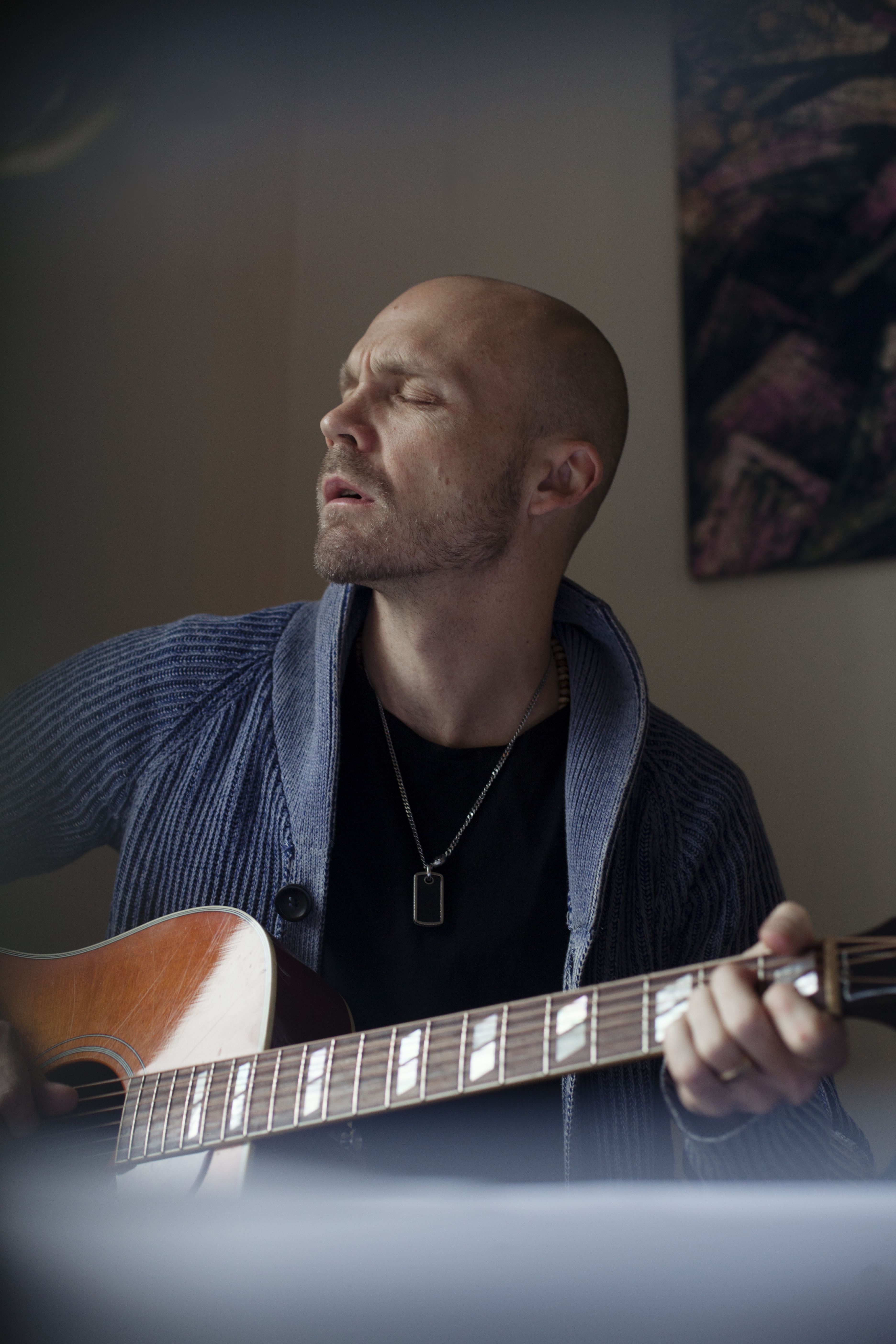 Kun koti on illalla hiljainen, Juha Tapio istuu sohvannurkassa kitara sylissä. Ikkunasta näkyy vaahtera.
