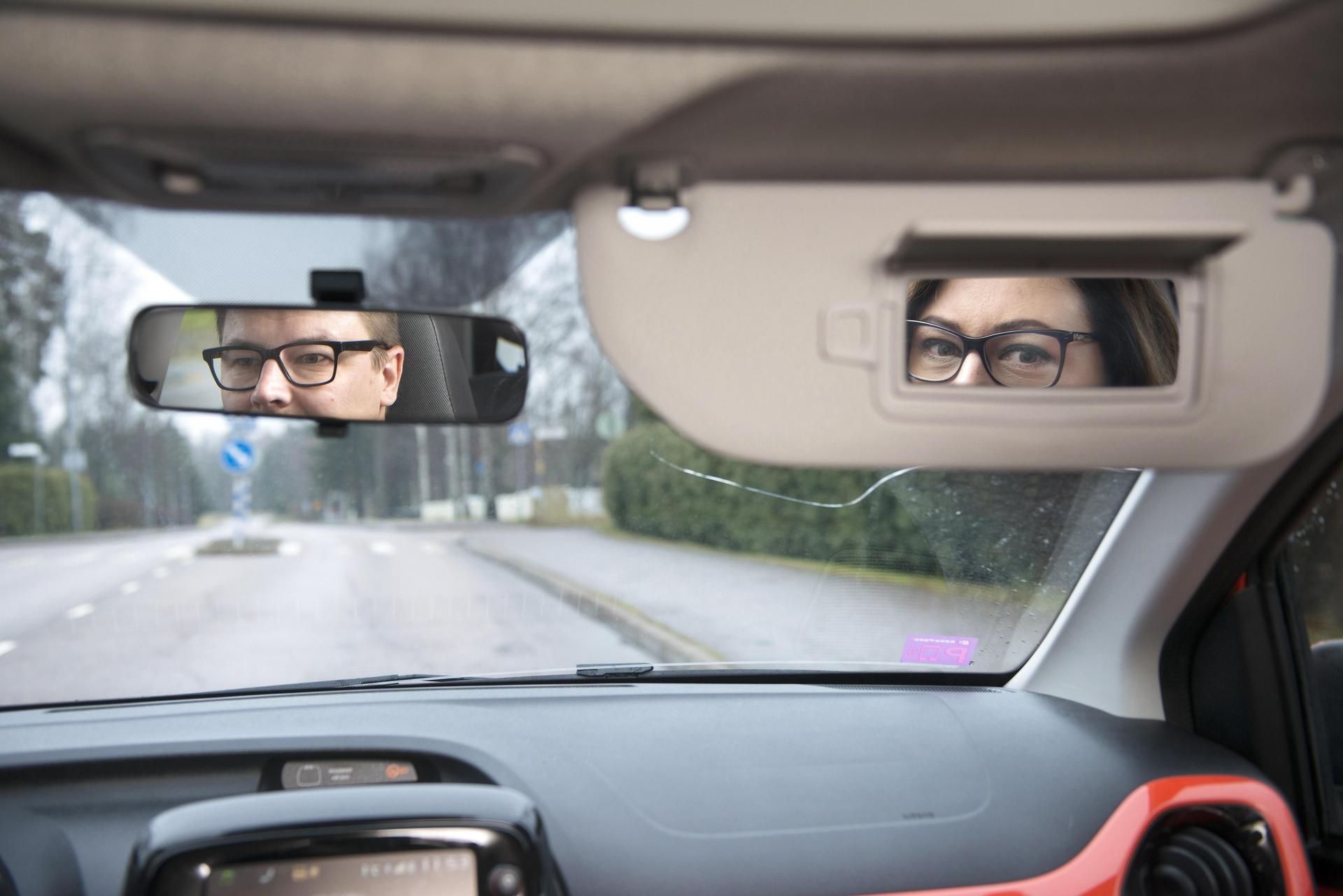 Vierekkäin autossa istuessa on helppo puhua, kun toista ei tarvitse katsoa silmiin. Siksi autossa on myös helppo riidellä, mutta ääntä Katja ja Mika eivät korota.