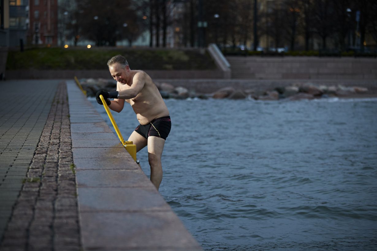 Opin pian, että kylmä vesi on totaalinen kokemus kropassa. Juuri ennen veteen menoa minulle tulee viimeinen mukavuudenhaluinen hetki: miksi mennä, kun ei ole pakko? Siirryn silti reippaasti portaille ja mereen. Ensimmäiset viisi sekuntia vedessä ovat vaikeimmat: uskallan, pysyn vedessä ja voitan itseni. Kylmyys nollaa stressin ja antaa hyvän olon tunteen. Se on henkinen ja fyysinen kokemus, eräänlainen kehollinen rauhoittumishetki, tapa olla yhtä meren kanssa.