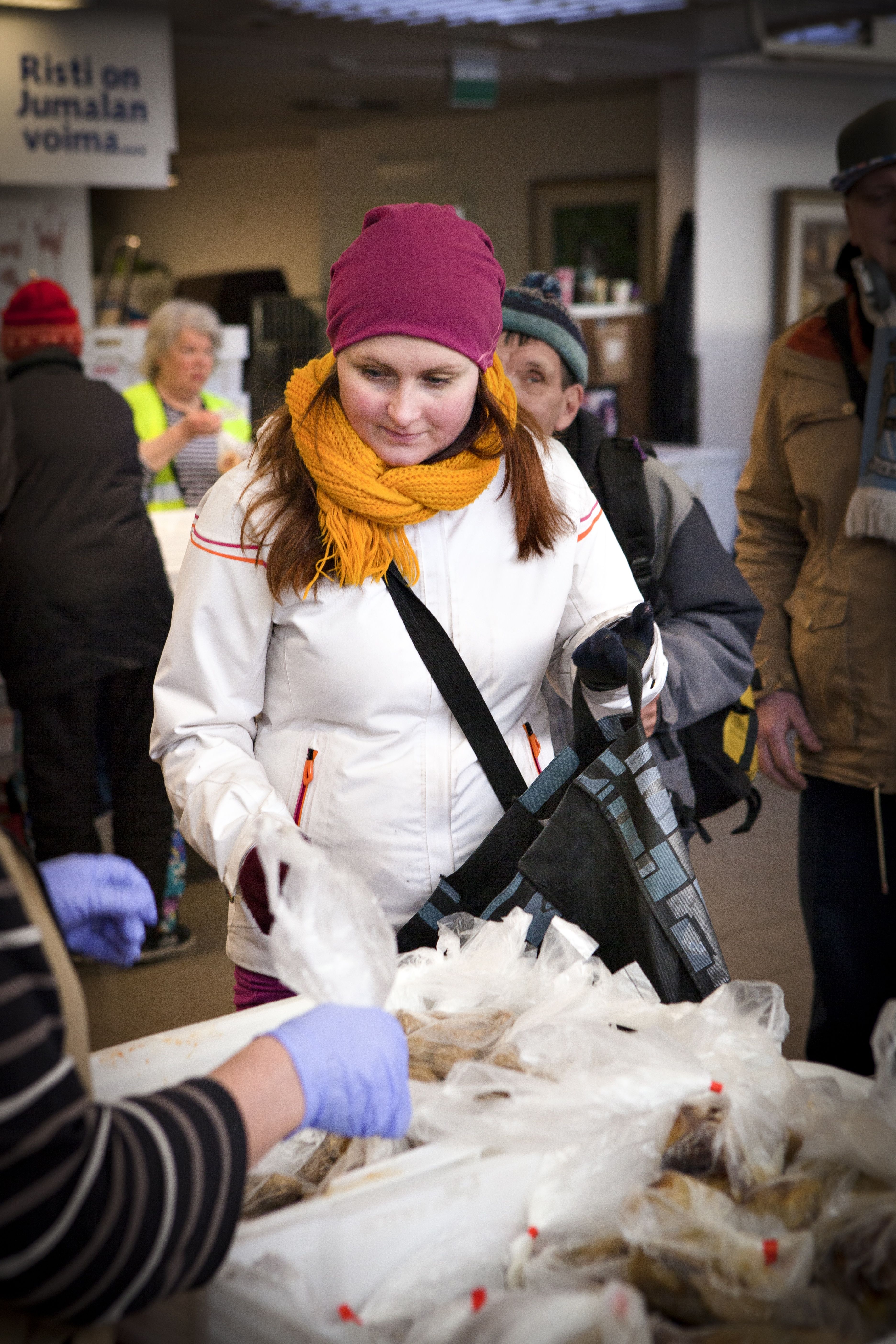 Metro saapuu Sörnäisiin. Tänään Hurstin ruokajakoon ei ole jonoa. Mari kiertää U:n muotoisen pöydän ja saa kassiinsa vitamiinitabletteja, lihapullia, hampurilaistahnaa, kurkkupikkelsiä, omenoita ja rinkeleitä.