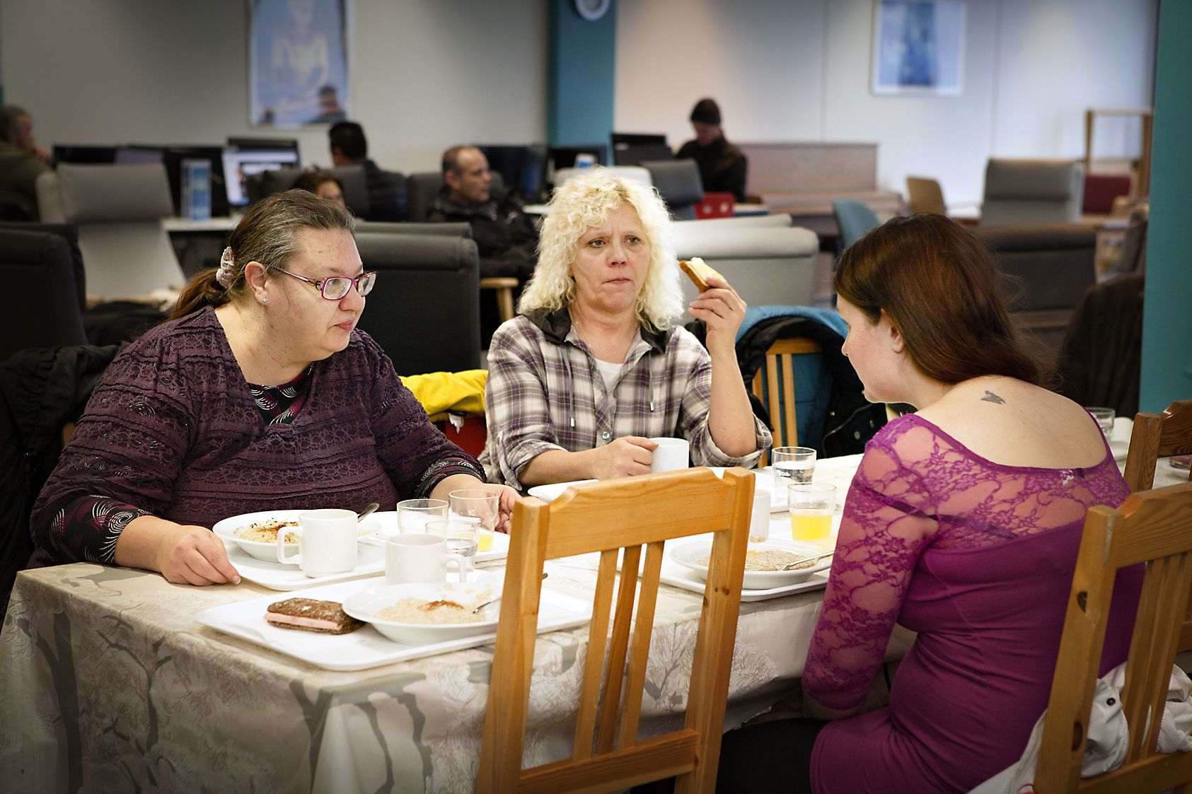 Ympyrän muotoon asetelluilla nojatuoleilla nuokkuu miehiä ja naisia. Tutut jo moikkailevat pöydistä, mutta ensin Mari poimii tiskiltä juustoruissarin, kaataa kahvia kuppiin ja kauhoo ruispuuroa lautaselle. Kaikki tämä maksaa vain 20 senttiä.