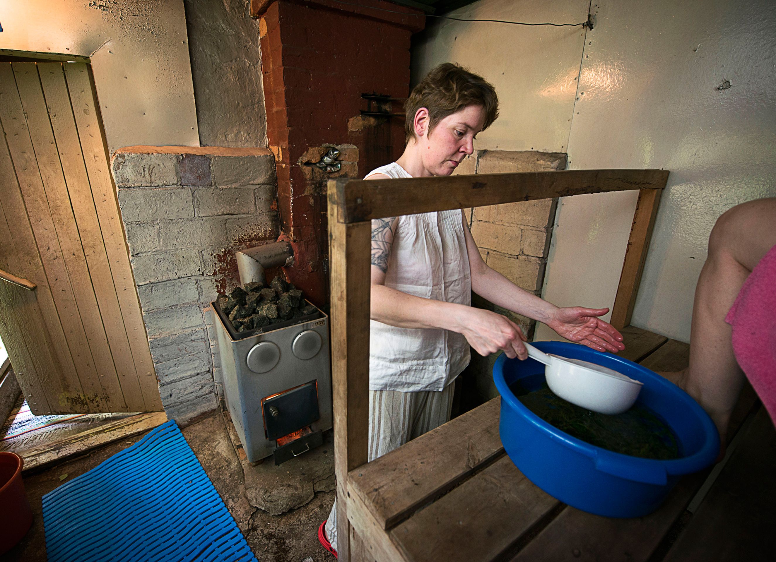 Irene roiskii kosteutta seiniin ja alkaa heittää löylyä. Hiki kirpoaa heti, mutta hengittäminen on helppoa. Sauna on hyvä, vaikka ulkoa näyttää, että katto romahtaa koska tahansa.