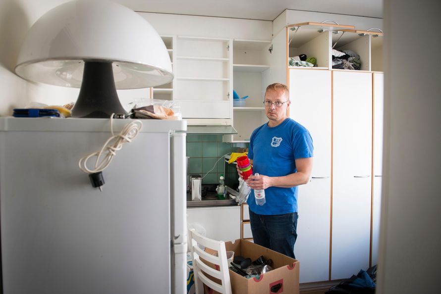 Lopulta sain häädön. Sosiaalitoimisto hoiti apulaiset tyhjentämään kamani varastoon. Katselin ovensuussa.