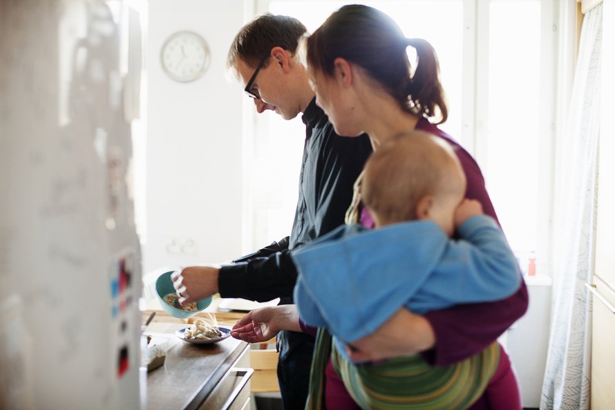 Tänä aamuna Annukan ja Leon lapsi ei halua työntää punaista taaperokärryä eikä ainakaan avata suutaan aamupuurolle. Hän haluaa vain istua kantoliinassa ja painaa poskea äidin olkapäähän. Annukka Bergiä, 34, huolettaa vähän. Lapsi on nukkunutkin levottomasti.
