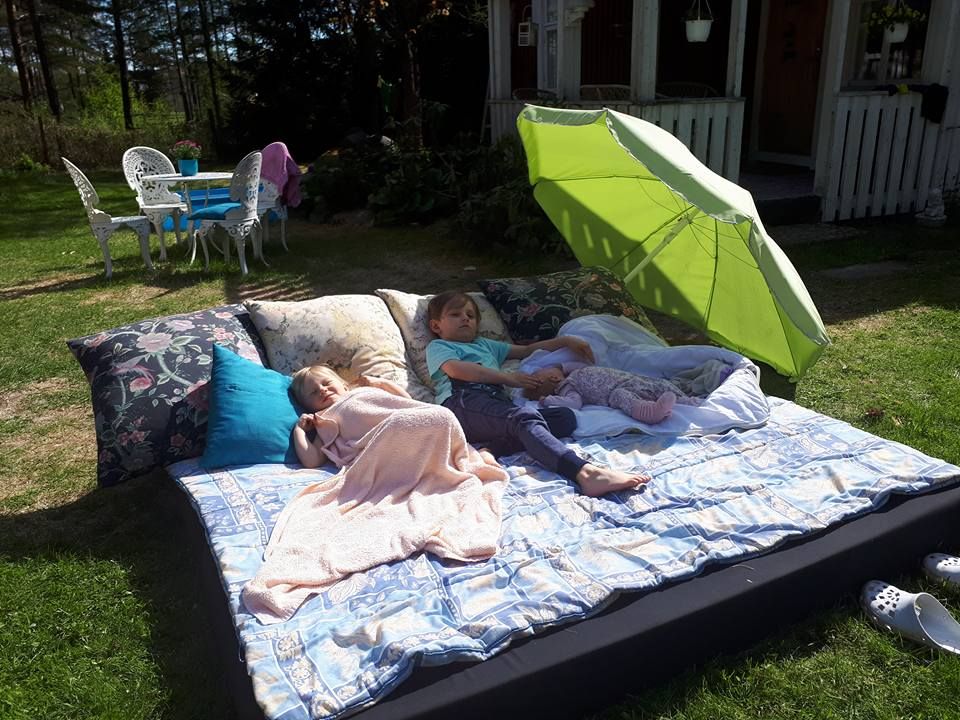 "Pienten lasten hoitaminen on ihanaa mutta raskasta työtä. Vaikka meitä oli kaksi aikuista hoitamassa, olimme koko ajan täystyöllistettyjä. Iltayhdeksältä olimme itsekin jo ihan loppu ja valmiita nukkumaan", Maarit sanoo.