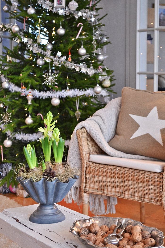 Valitsen joulupöydän astiat kulloisenkin joulun teemavärin ja kukkien mukaan. Aterimina ovat aina pöytähopeat ja jälkiruokakahvit juodaan joko Arabian Valenciasta tai kultalautasellisesta Mira-mokkakupeista.