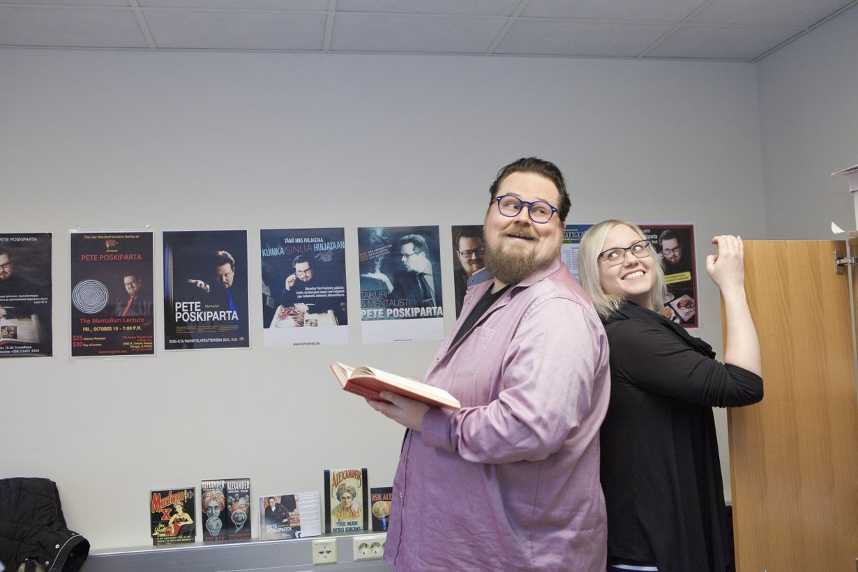 Marja: Peten erikoisalaa on mentalismi. Hän siis luo illuusion siitä, että kykenee lukemaan ajatuksia tai tietää asioita ennalta. Suhteen alussa olin tosi kiinnostunut, miten Pete osaa luoda illuusion, että yleisövieraan pää kutistuu lavalla tai tietää, mitä väriä ihminen ajattelee. Kyllä hän kertoi salaisuudet, kun olimme naimisissa. Vähitellen lakkasin pitämästä mentalistin työtä jotenkin ihmeellisenä. Ei kai yksikään nainen jatkuvasti jaksa olla fiiliksissä siitä, mitä puoliso on työpäivänsä tai -iltansa aikana tehnyt?