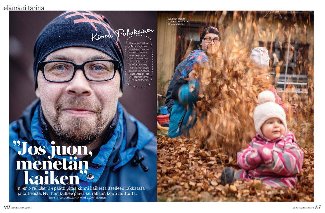 Kun Kimmo Puhakaista haastateltiin Kodin Kuvalehteen syksyllä 2016, hän oli vasta luopunut alkoholista. Päätös raitistumisesta on pitänyt.