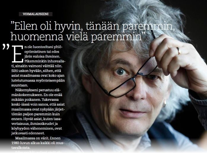 Näkemykseni perustuu elämänkokemukseen. En ole enää mikään poikanen. Tukevassa keski-iässä voin sanoa, että asiat maailmassa ovat nykyään järjettömän paljon paremmin kuin ennen. Hyvät asiat, kuten tasavertaisuus, ihmisoikeudet ja köyhyyden väheneminen, ovat jatkuvasti edenneet.