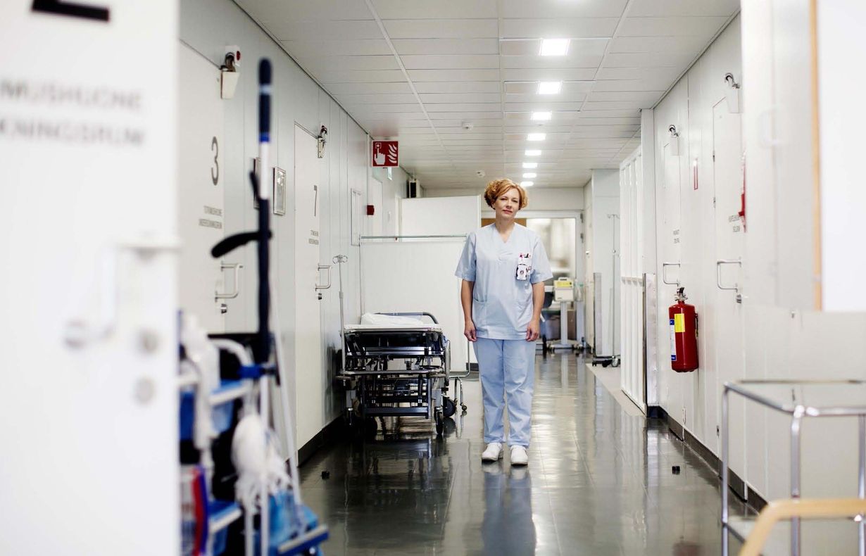 "Kylmänä aamuna vedän jalkaan itse kudotut villasukat. Osastolla vetää aika lailla. Panen kotivaatteet kaappiin, puen työvaatteet päälle. Siitä päivä alkaa kello 7.45.