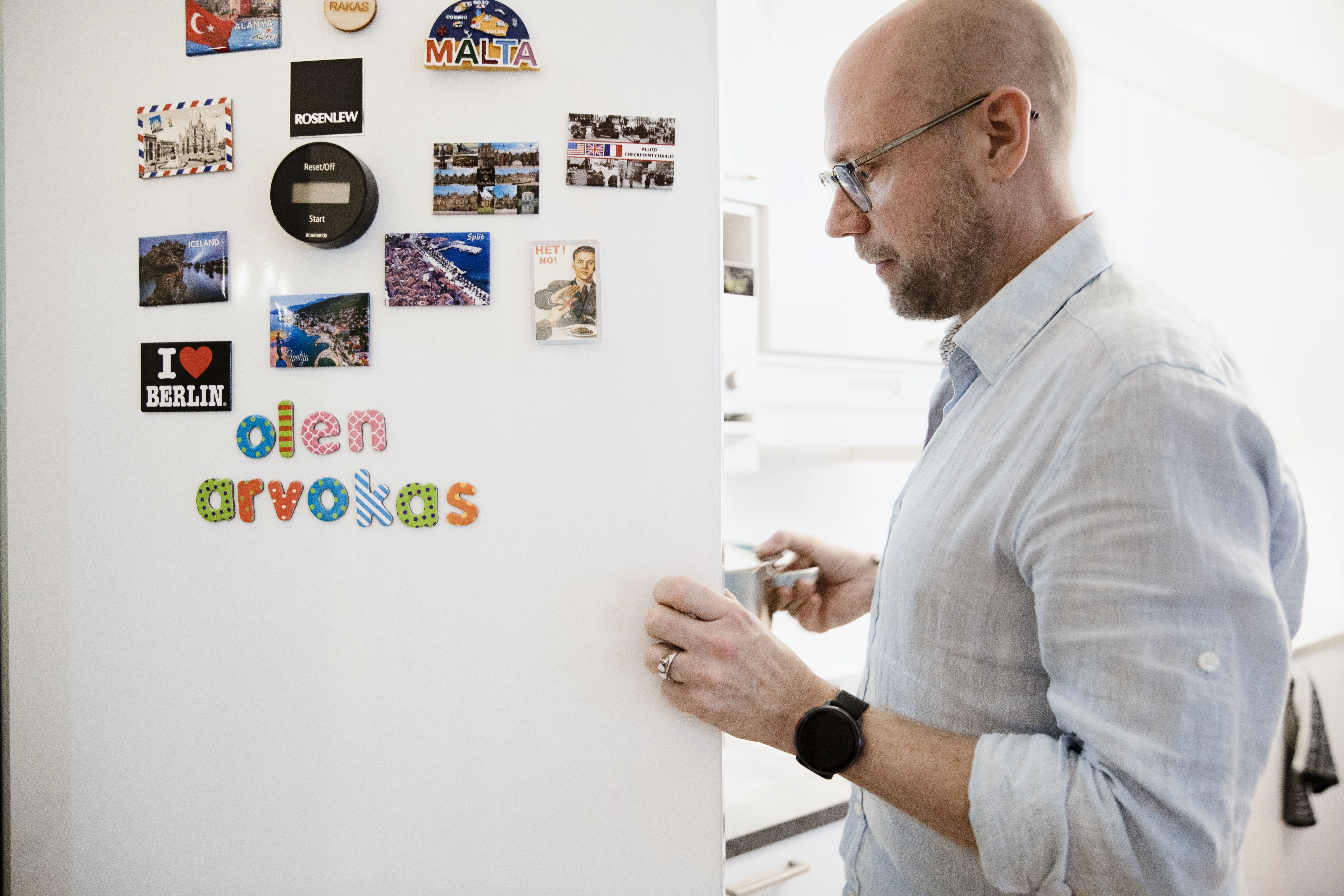 Keittiö on kodin keskellä, samaa tilaa kuin olohuone. Jääkaapin valkoinen ovi näkyy eri puolille kotia, sohvalle ja ruokapöytään. Iikka Forss, 48, on kirjoittanut oveen värikkäillä magneettikirjaimilla sanat ”olen arvokas”.