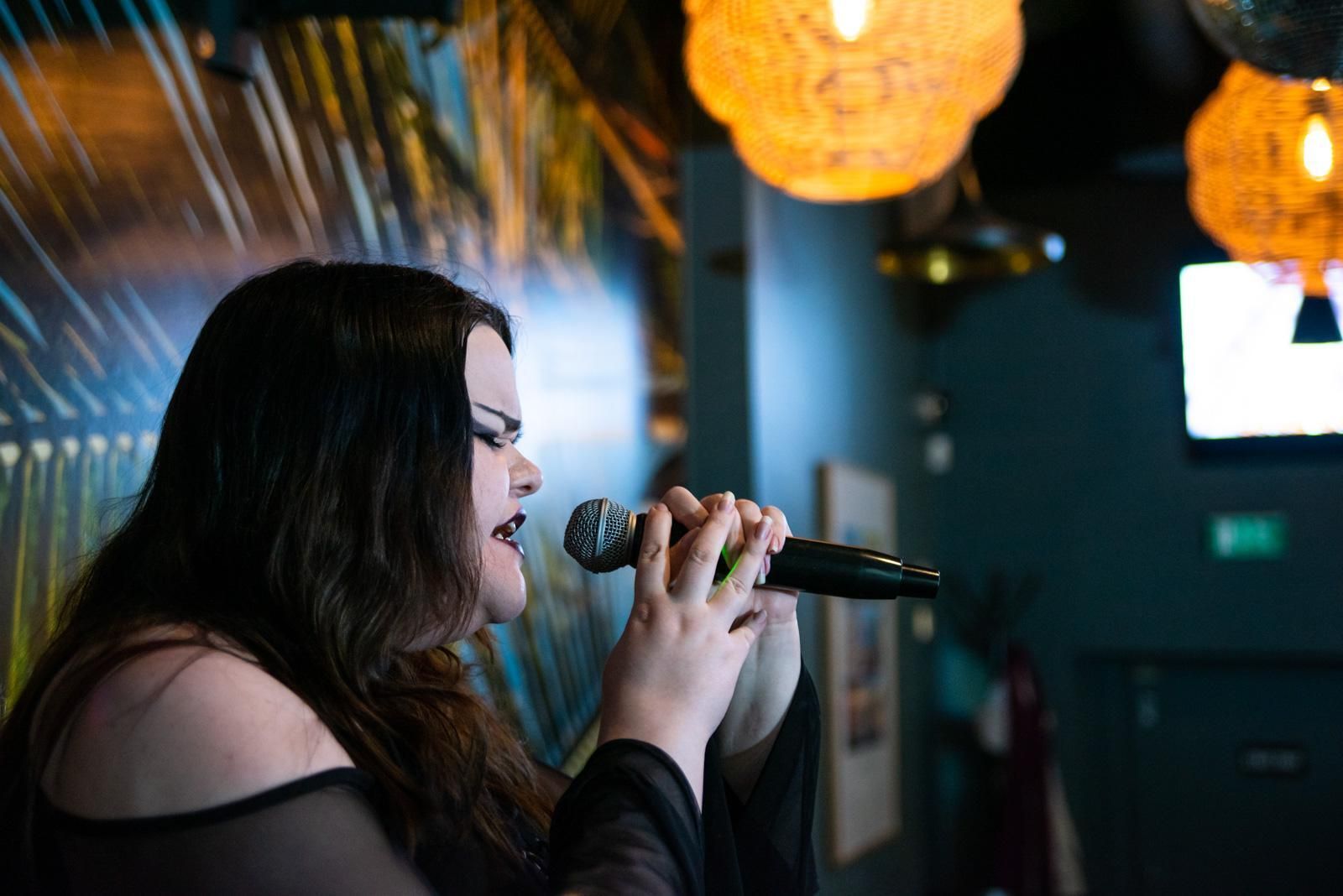 Lavalla laulanut nainen, tamperelainen Oona Hanhikoski, 25, palaa pöytäänsä. Hän juo kokista ja näyttää taas ujolta.