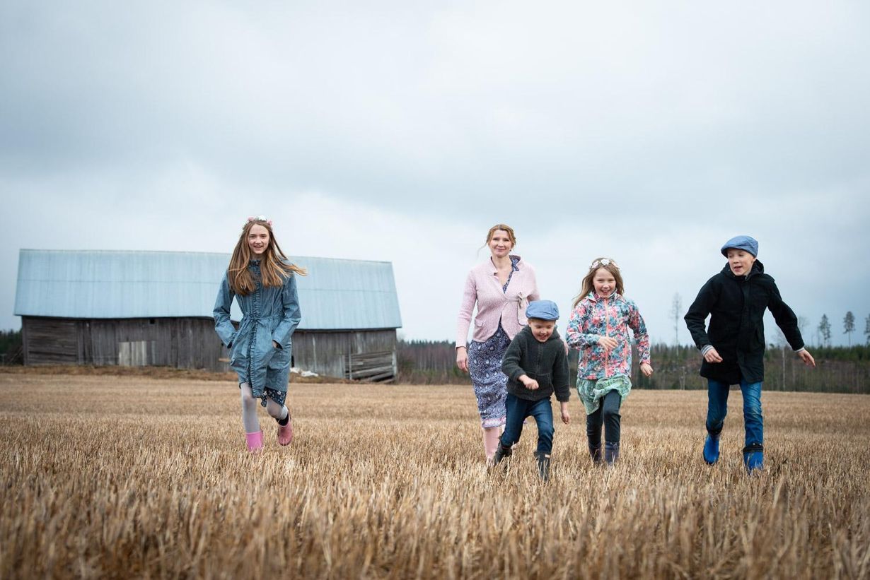 Näkymä kodin takapihalta on Paulalle maailman rakkain maisema. Nelli, Niilo, Nilla ja Nooa ovat muistikuviensa mukaan leikkineet pellolla ”aina”.