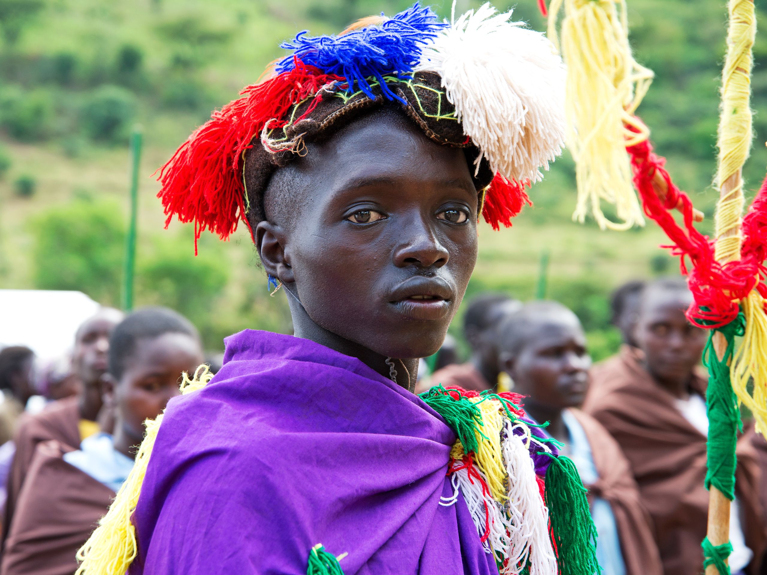 Pokot-heimon juhla-asuun pukeutunut lukiolaispoika toivotti Panulat tervetulleiksi Keniaan.