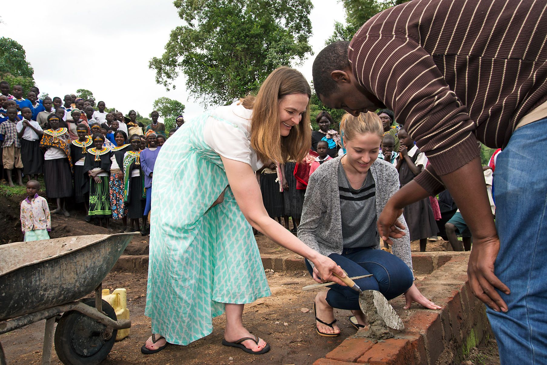 Virpi muuraa asuntolan peruskiveä. ”Voihan sen muurauskurssin käydä näin Keniassakin.”
