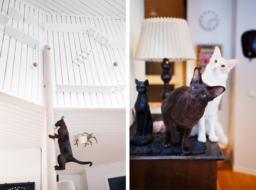 ”Kissat käyttävät joka päivä kiipeilyseinäänsä. Kun yksikin kissoista kiipeää seinälle, minulta loppuu muu tekeminen. Kiipeily on upeaa katseltavaa. Minun myös tekee mieli seurata, että meno on turvallista. Kaikilla kissoillamme on kummit, ja mekin olemme puolisoni kanssa tuttavakissojen kummeja. Sain juuri kutsun yksiin kissan ristiäisiin.”