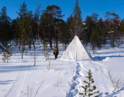 Puiset ahkiot tuoksuvat tervalta. Niihin on lastattu teltta, laavu ja muutaman kuukauden eväät. Kuivattua kaalia, punakaalia, lanttua, naurista, perunaa, porkkanaa, selleriä, fenkolia, kurpitsaa ja punajuurta. Riisiä ja makaronia, paljon. Sangollinen survottua puolukkaa. Kuivakalaa ja kahvia. Toisesta ahkiosta törröttävät itse rakennetun kodan runkopuut.