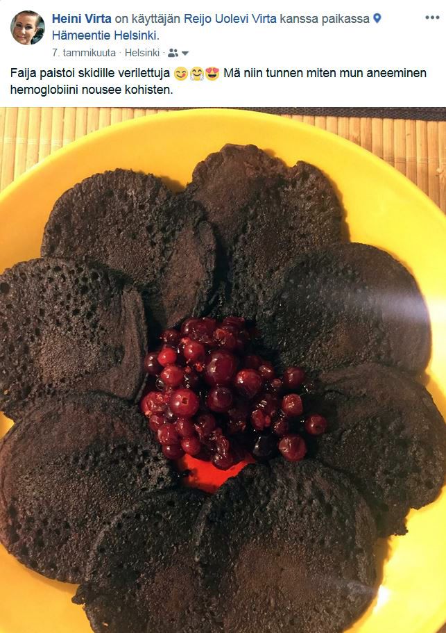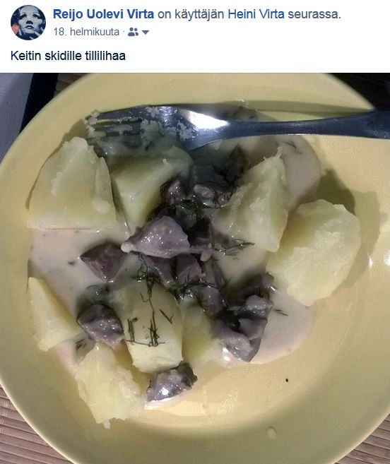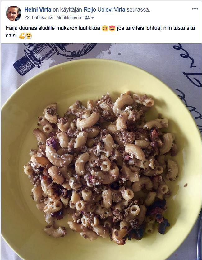 Heini on ottanut syömisen aikana ruokakuvan. Nyt hän postaa sen Facebookiin ja kirjoittaa: ”Faija laittoi taas skidilleen ruokaa”. Sunnuntaipostauksia odottavat Heinin ystävien lisäksi faijan ystävät.