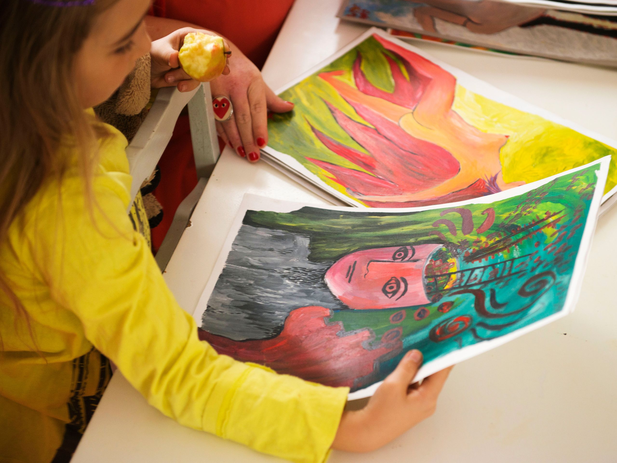 Seela katselee maalauksia, joita äiti teki ensikodin taideterapiassa vuonna 2007