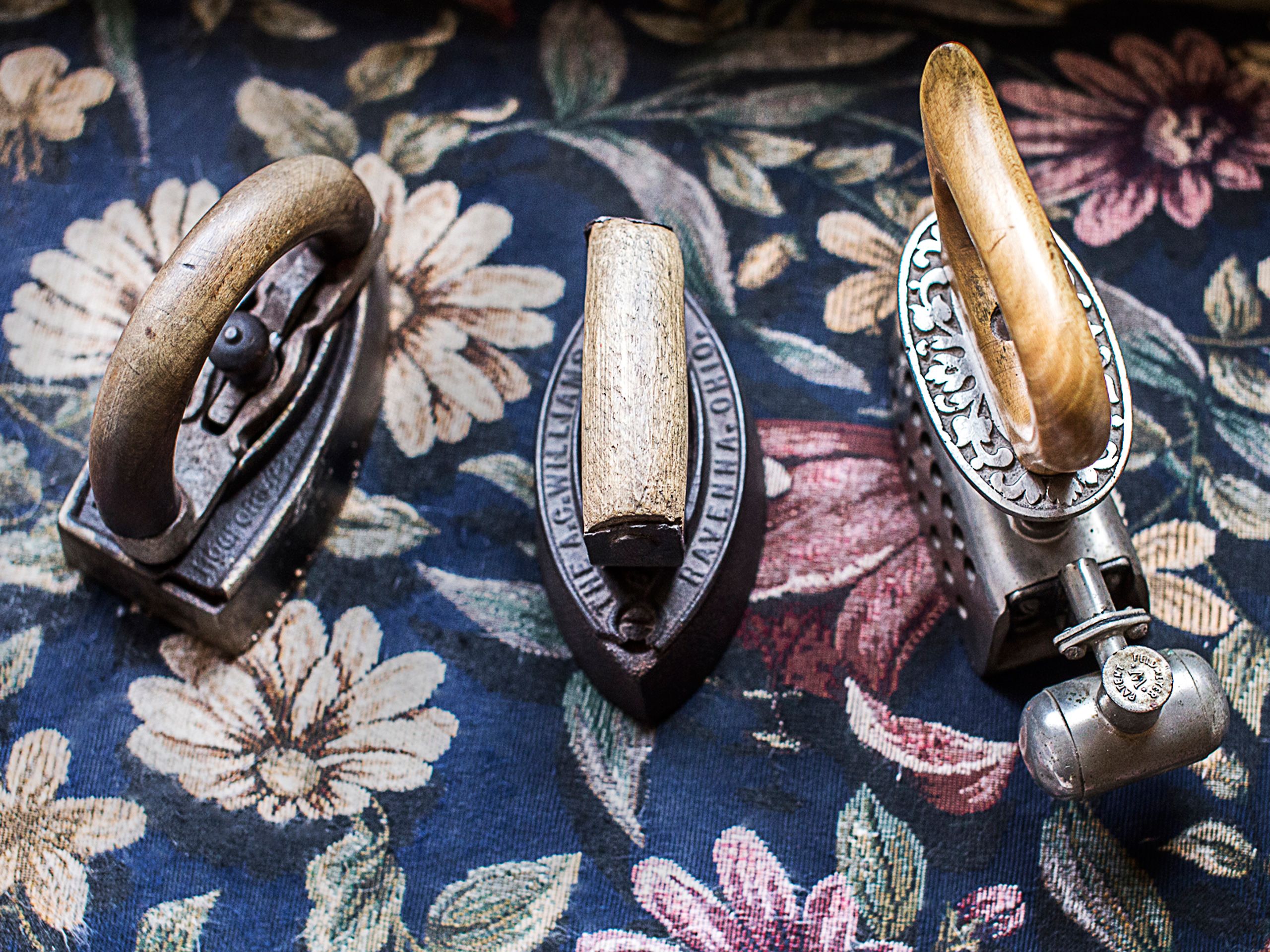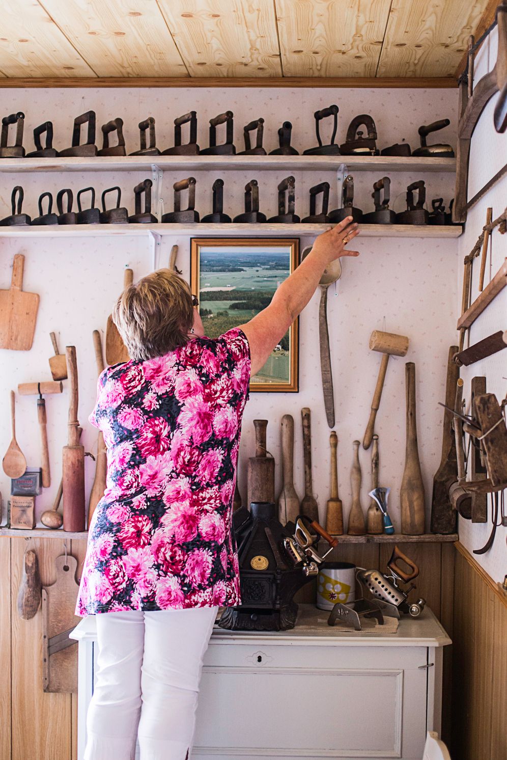 Ne ovat nättejä ja sympaattisia: vähän ruosteisia ja raihnaisia. Olen hurahtanut moneen muuhunkin. Minulla on pihallani kotimuseo, jossa on purkkeja ja purnukoita, yli 40 kahvipannua ja seinällinen kahvikuppeja. Tuvastamme löytyy nuijakokoelma. Minulle tulee kausia, jolloin haluan kerätä jotain tietynlaista. Nyt on menossa pilkullinen vaihe. Mutta rautakausi on ja pysyy. Silitysrautoihin minulla on elinikäinen rakkaussuhde.