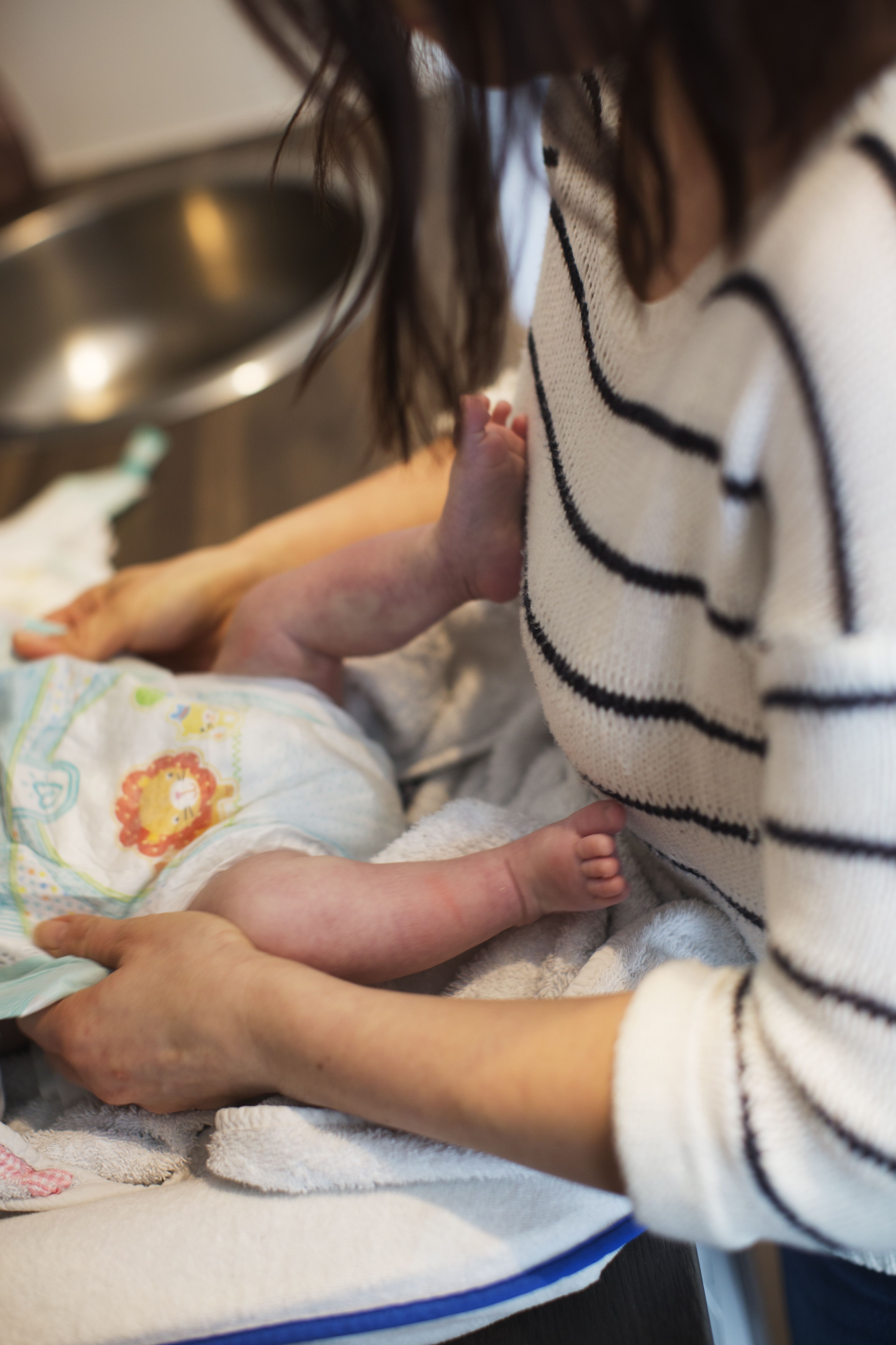 Hissillä melkein ylimpään kerrokseen, sairaala kohisee ympärillä. Vastasynnyttäneiden osaston ovesta sisään, käsidesiä, sitten näytetään henkilöllisyystodistus hoitajalle.
