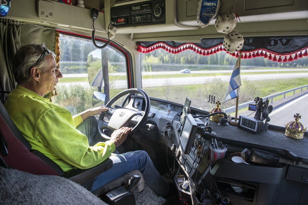 Tommi Rae, 60, on ajanut rekkaa vuodesta 1984 saakka. Takana on melkein viisi miljoona kilometriä. ”Vaikka voisi kuvitella, tämä työ ei ole yksinäistä hommaa. Muista kuskeista saa aina juttukavereita.”