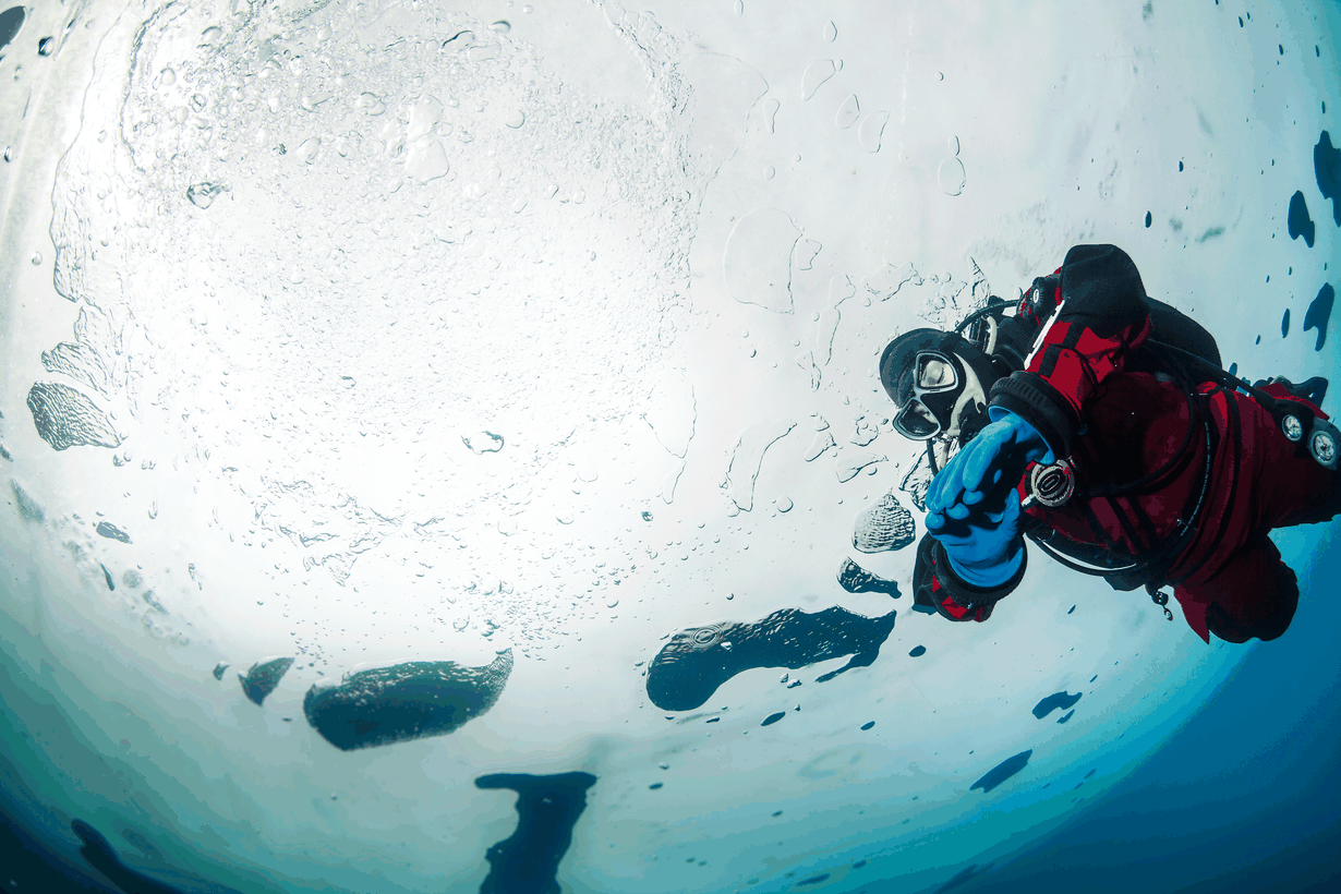Sukellan paljon louhoksissa, Saimaan virtaavissa vesissä ja Vuoksessa. Vesi on aina kylmää. Jään alla on kirpsakan kirkasta vettä. Ilmakuplalautat lentävät kuin rauskut pitkin jään alapintaa.