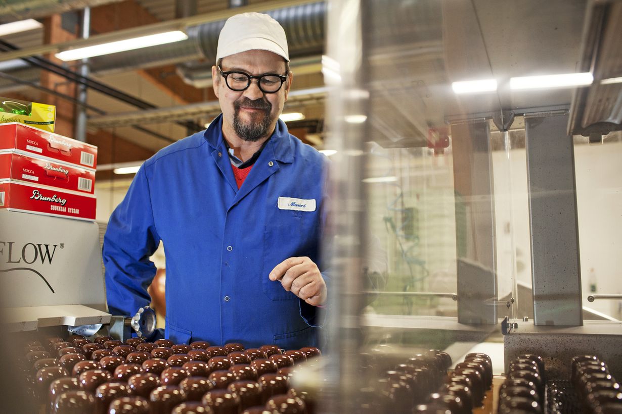 Suklaatehtaalla työskentelevä Mauri Niemelä on joutunut vanhemmiten vähän rajoittamaan herkutteluaan.