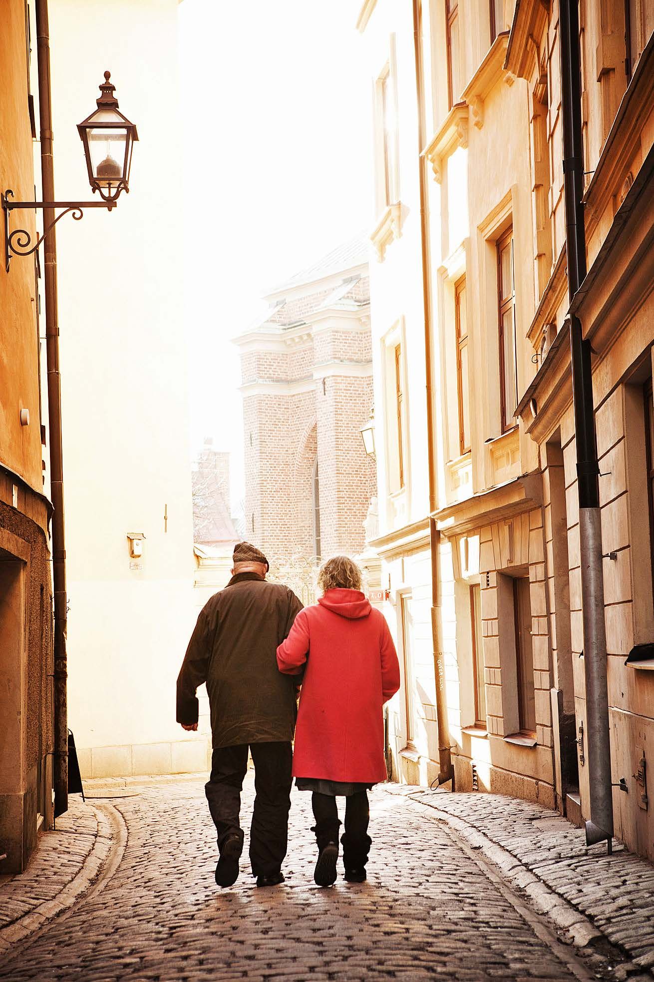 Tukholman vanhassa kaupungissa on jyrkkiä ylämäkiä. Anna huolehtii, jaksaako isä kävellä, on epätasaiset mukulakivetkin. Timo on varma, että jaksaa.