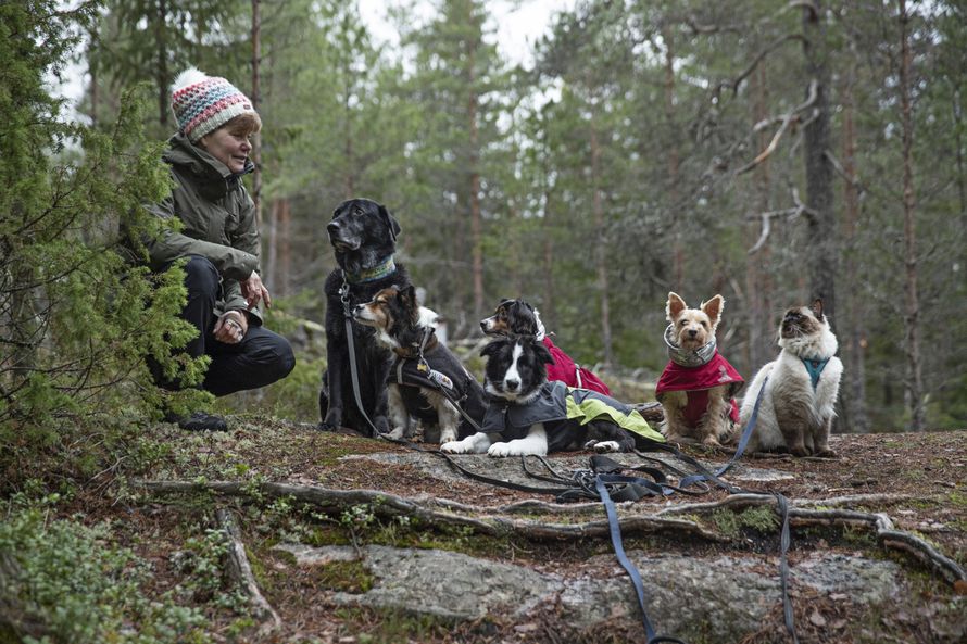 Tuula Ojala-Nurmi, 58, aikoo kiertää kaikki Suomen kansallispuistot iloisen eläinlaumansa kanssa.
