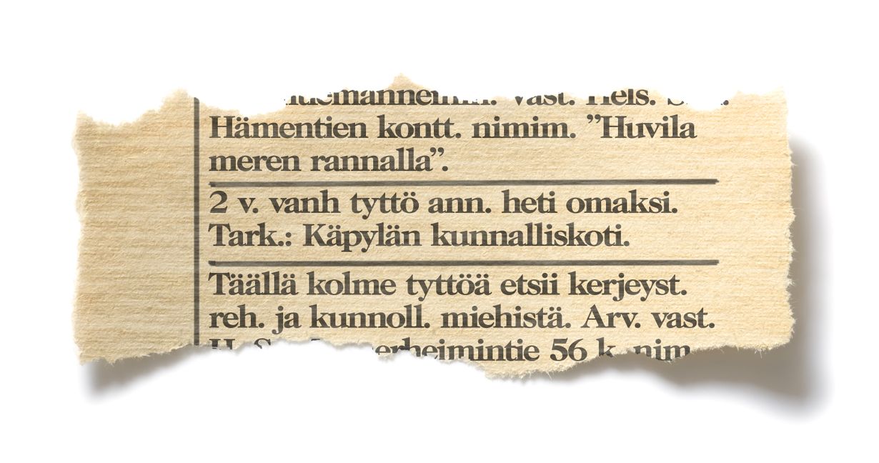 Tässä kuvassa on lehti-ilmoitus, jolla Liisa-Cristiina Laaksonen, 69, annettiin pois 1940-luvulla. ”Haluaisin yhä kysyä äidiltä: Miksi luovuit minusta? Mikset kertonut kellekään, kuka on isäni? Rakastitko minua?”