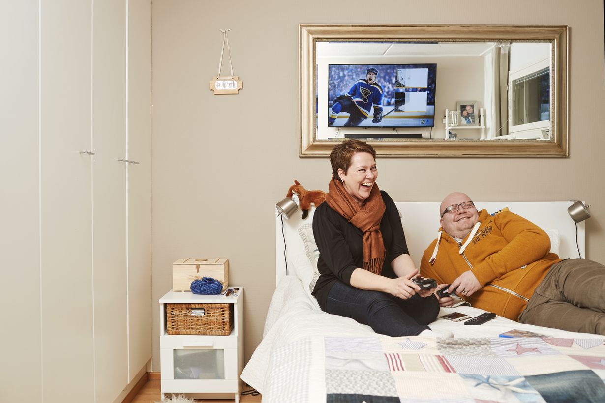 Makuuhuoneen seinään on pultattu iso televisio. Sängystään Hanna ja Sami katsovat elokuvia ja sarjoja, mieluiten toimintakomediaa ja Netflixin poliisisarjoja Kovat kaulassa tai Brooklyn 99.