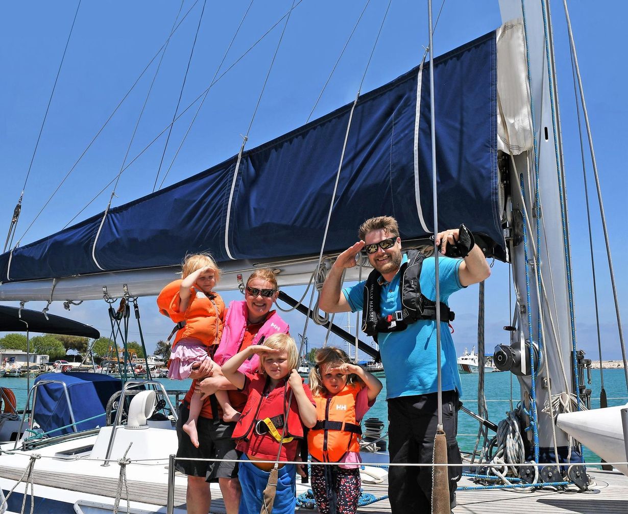 Riikka, 45, ja Tuomo Meretniemi, 46, sekä lapset Aarre, 9, Kerttu, 7, ja Martta, 5, ovat asuneet purjeveneessä nyt kaksi vuotta. Vanhemmat päättivät irtisanoutua, myydä perheen omakotitalon ja kesäpaikan ja lähteä pitkälle purjehdukselle, jotta heillä olisi aikaa olla rauhassa perheen kanssa. Silti kesti yli kahdeksan kuukautta ennen kuin rauhoittumisen tunne tuli.