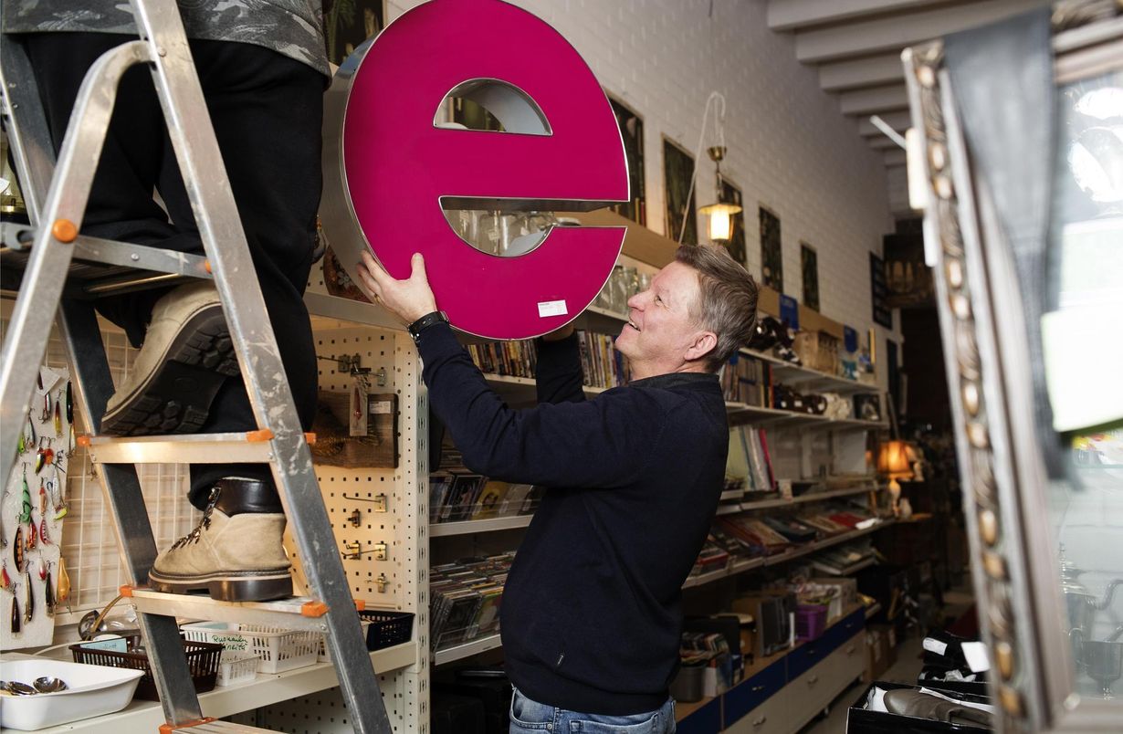 Esa Salminen, 55, pitää kirpputori Kisälliä Lahden Sopenkorvessa, ja hänen perheeseensä kuuluvat vaimo ja kaksi aikuista lasta. E-kirjaimen Esa osti mieheltä, joka purkaa vanhoja valomainoksia. Myyntiin menee.