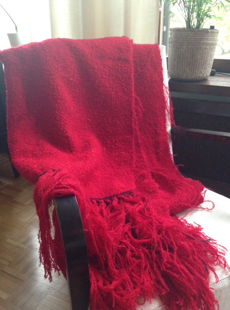 "Kudontakurssilla 1998 lenkkimohairista ja kampavillasta kutomastani kankaasta piti tulla jakku. Onneksi homma jäi silloin vaiheeseen, jotta voin pätkäistä osasta kankaasta ihanan shaalin. Pitäisi vain solmia päät ja päätellä langat."