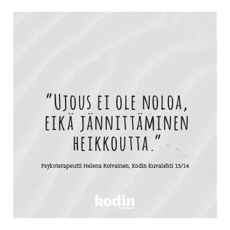 Tavallisin tapa selvitä häpeällisestä ujoudesta on vältellä hankalia tilanteita tai karaista itsensä. Jos herkkyyden itsessään kieltää kokonaan, menettää kosketuksen minuuteensa. Terapeuttina näen jatkuvasti, miten herkkyyden kuolettaminen uuvuttaa ihmisen. Herkkyys on ihmisyyden arvokkainta osaa. Sitä täytyy vaalia.