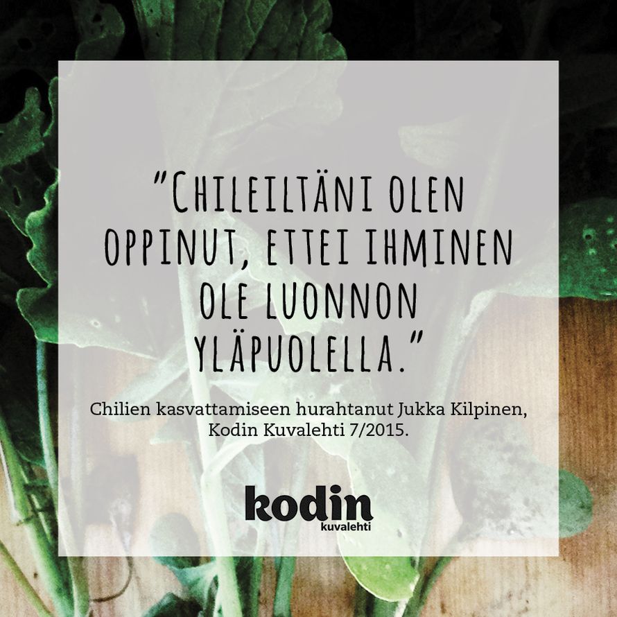 Luonto on ihmistä suurempi 31.5.2015 klo 15:01 "Chileiltäni olen oppinut, ettei ihminen ole luonnon yläpuolella." Chilien kasvattamiseen hurahtanut Jukka Kilpinen, KK 7/15. Tilaa Kodin Kuvalehti Tilaa Lue digilehtenä