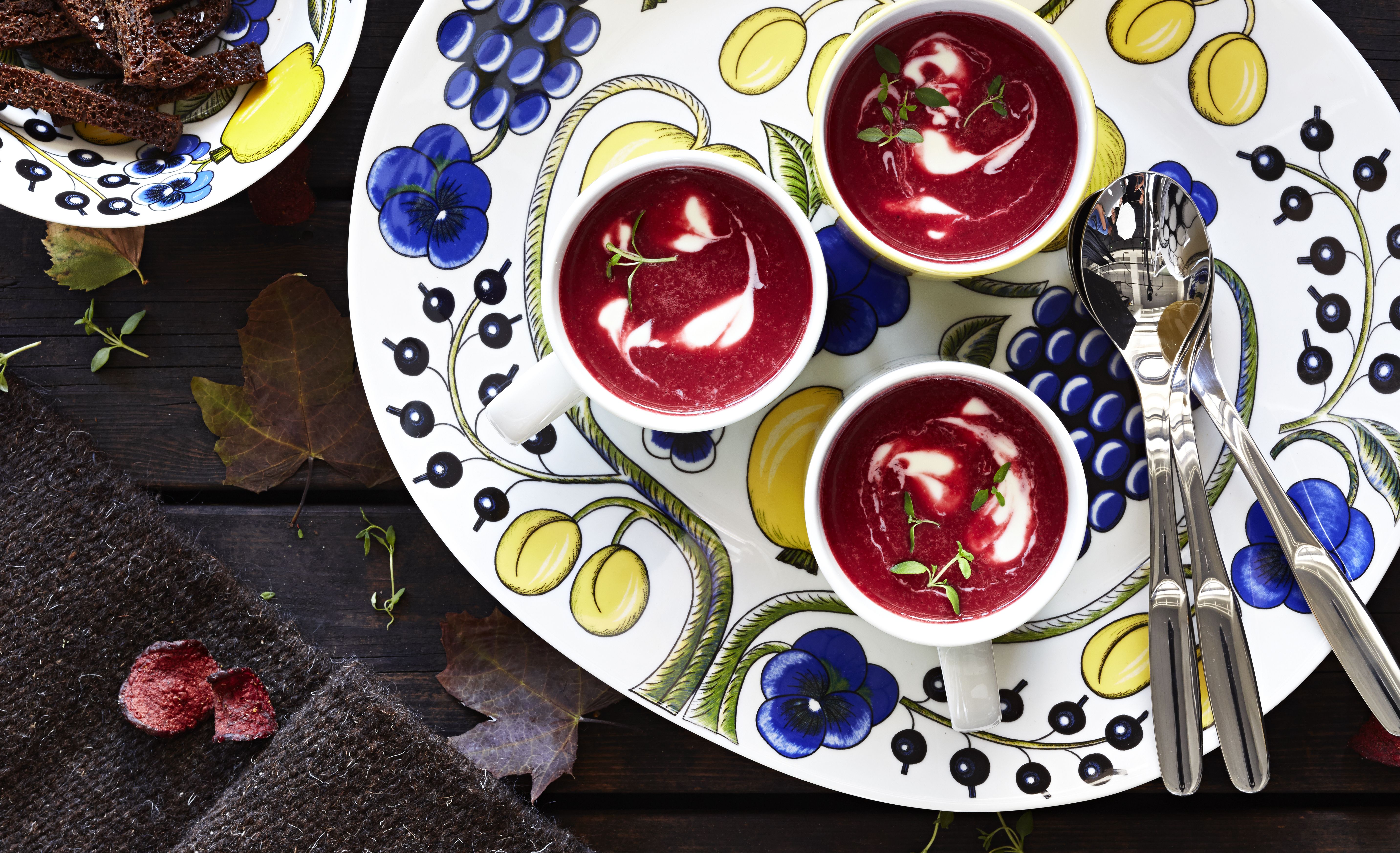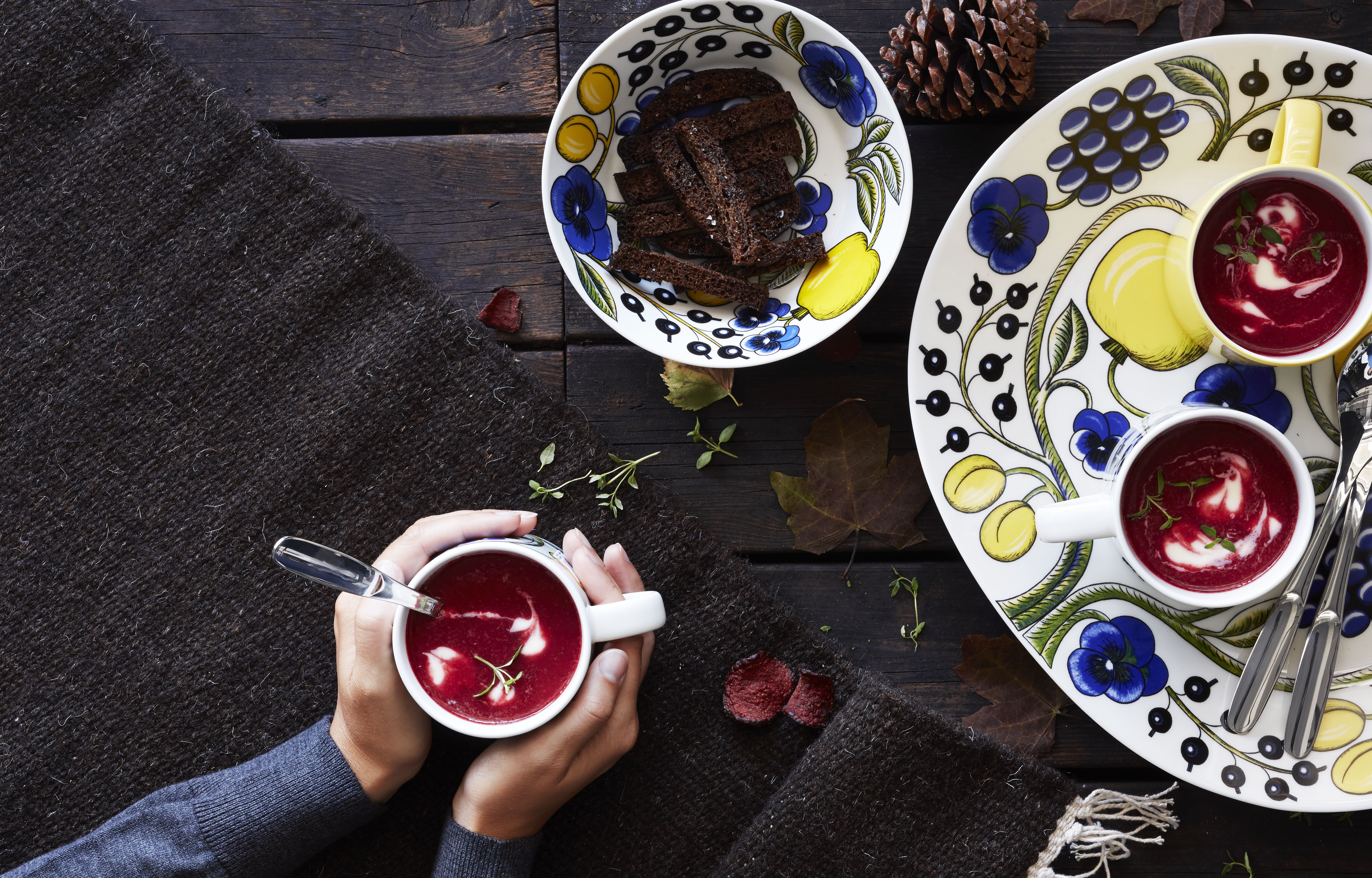 Keitto on helppo tarjoilla annoskokoisena suoraan sadonkorjuuaihetta toistavista Paratiisi-mukeista.