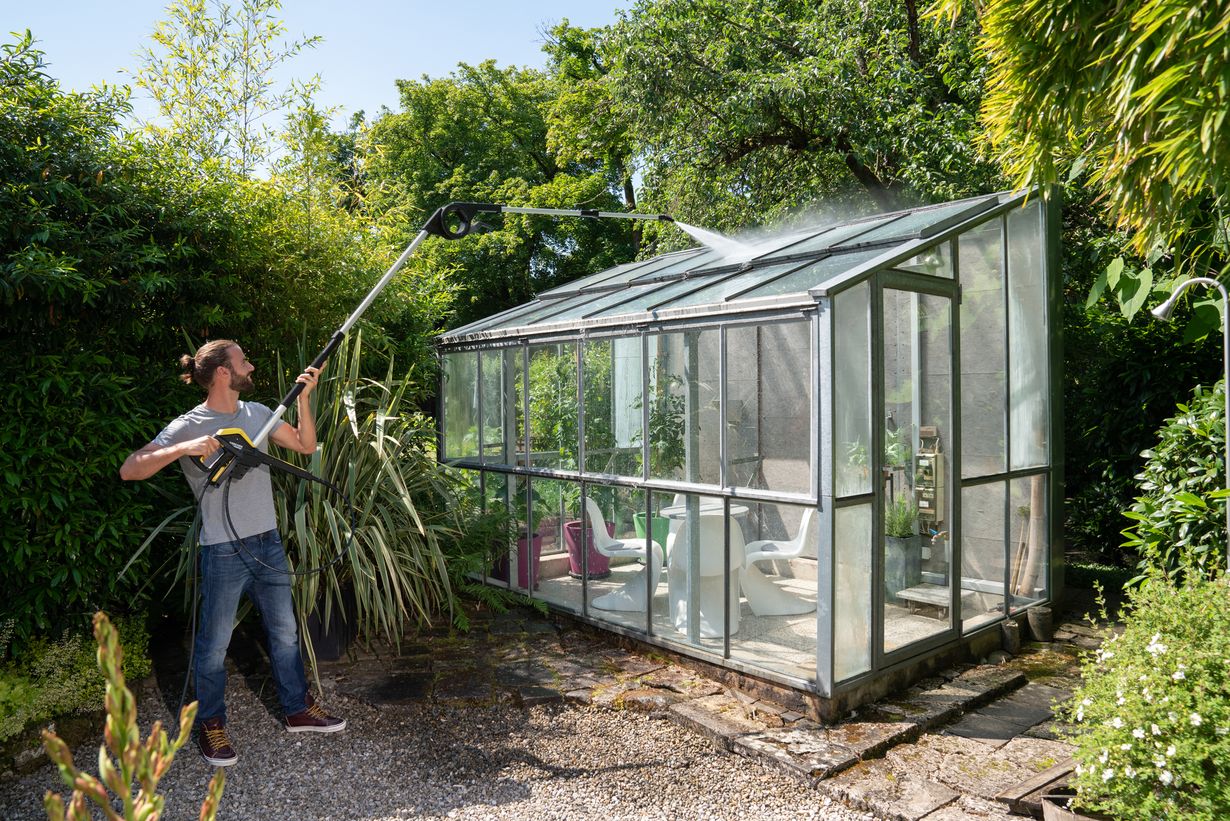 Terasseja suojaavat valokatteet keräävät helposti puista tippuvaa likaa ja alkavat ennen pitkää vihertyä ja tummua, ellei niitä pese säännöllisesti. Kärcher-jatkovarren avulla painepesurilla saa pinttyneetkin liat putsattua niin, että puutarha näyttää taas valoisalta.