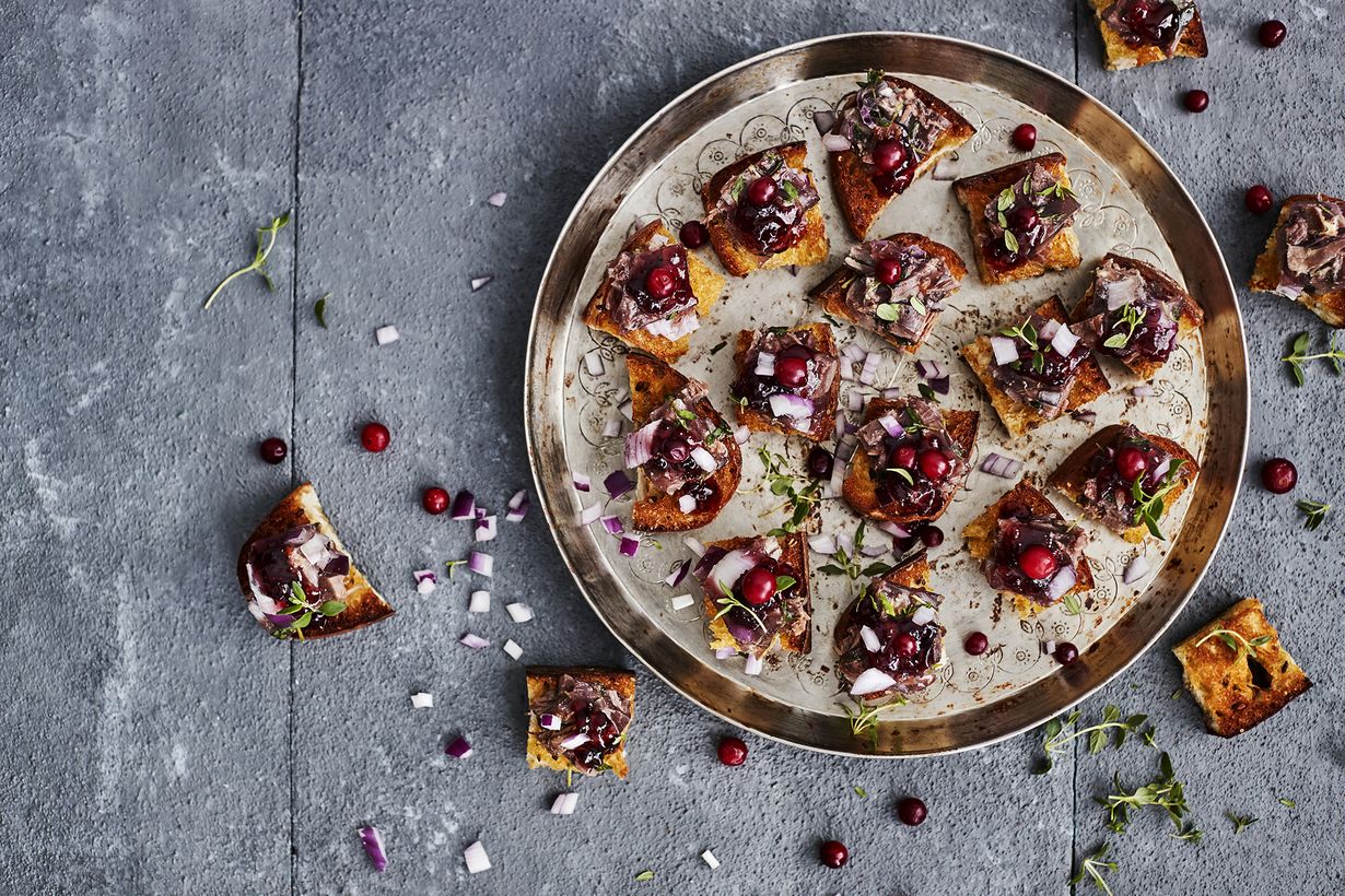 - Leikkaa jähmettynyt terriini paloiksi ja aseta jäähtyneiden leipäpalojen päälle. Tiputa päälle nokare karpalohilloa. Koristele karpaloilla ja timjamilla.