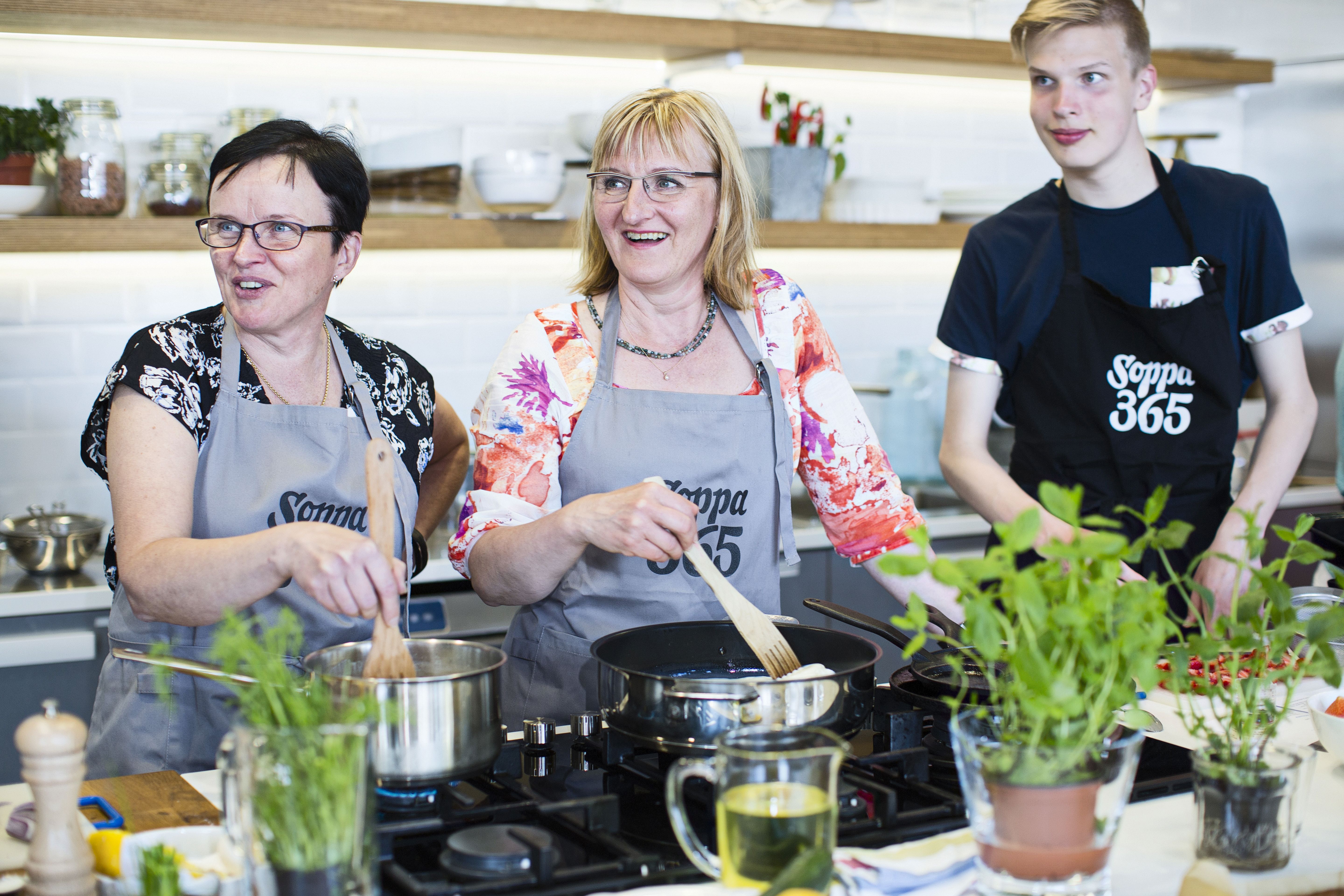 Kun samaa soppaa hämmensi monta kokkia, menivät suola ja sokerikin sekaisin. Se ei onneksi menoa hidastanut - päin vastoin!