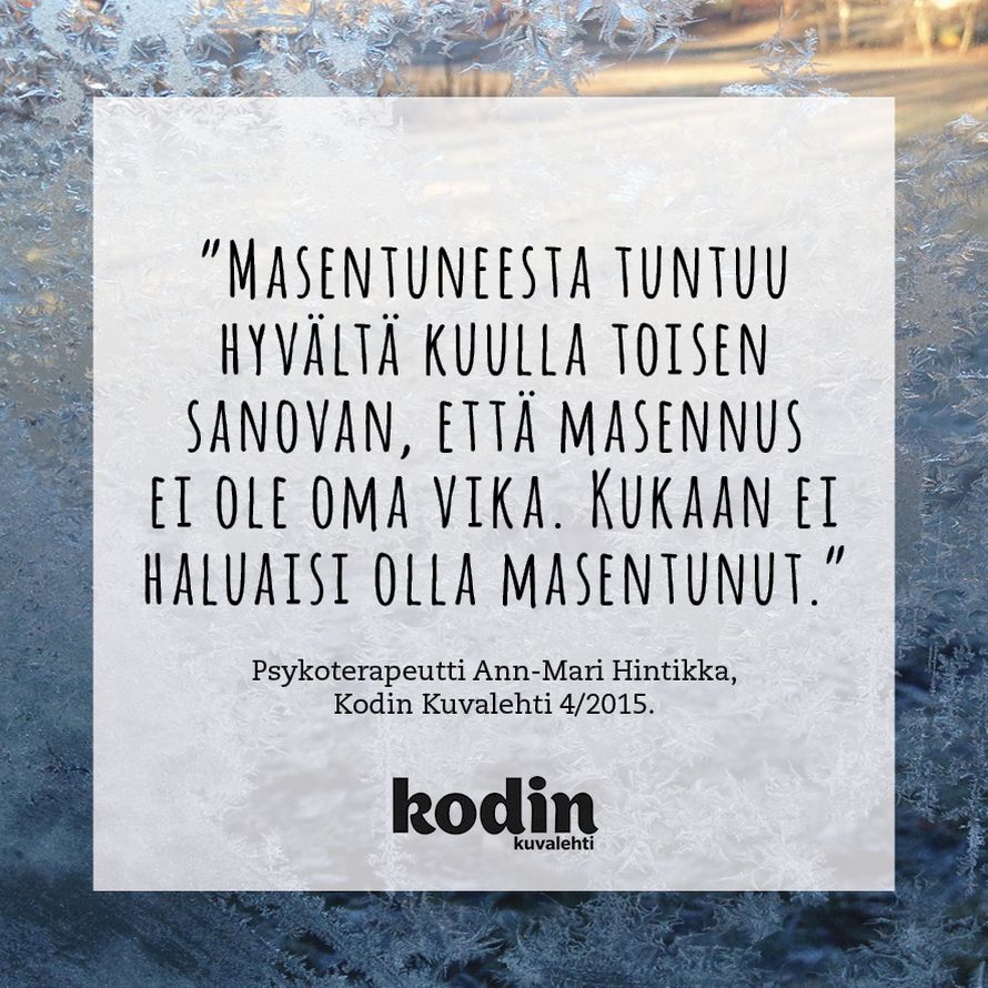 Masennus ei ole oma vika 17.4.2015 klo 12:46 "Masentuneesta tuntuu hyvältä kuulla toisen sanovan, että masennus ei ole oma vika. Kukaan ei haluaisi olla masentunut." Psykoterapeutti Ann-Mari Hintikka, KK 4/15 Tilaa Kodin Kuvalehti Tilaa Lue digilehtenä
