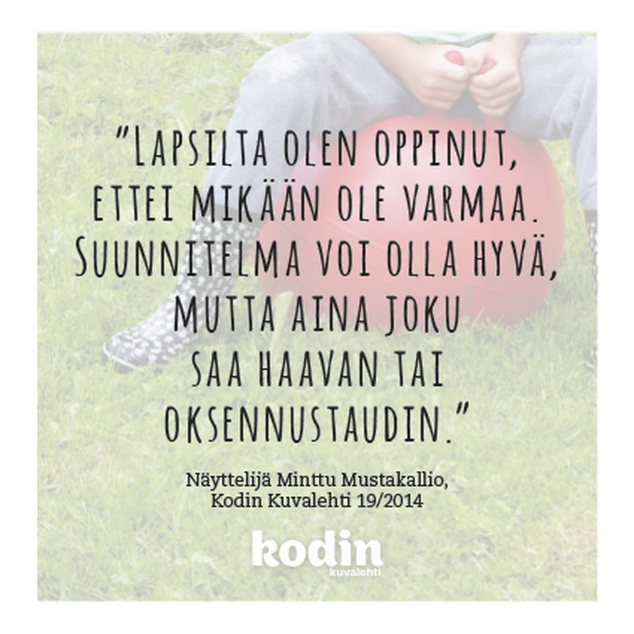 "Lapsilta olen oppinut, ettei mikään ole varmaa. Suunnitelma voi olla hyvä, mutta aina joku saa haavan tai oksennustaudin." Näyttelijä Minttu Mustakallio, KK19/2014